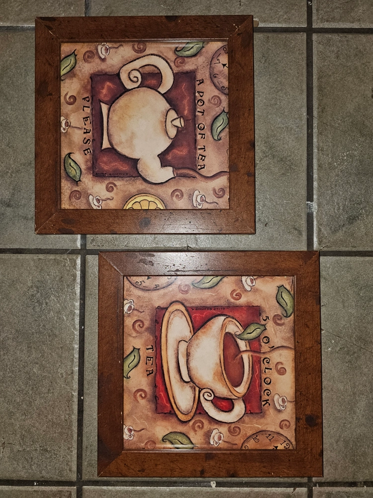 Two framed wall art pieces featuring a teapot and a teacup design. Perfect for adding a touch of charm to your kitchen or dining area!
