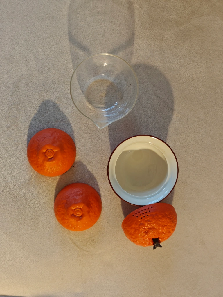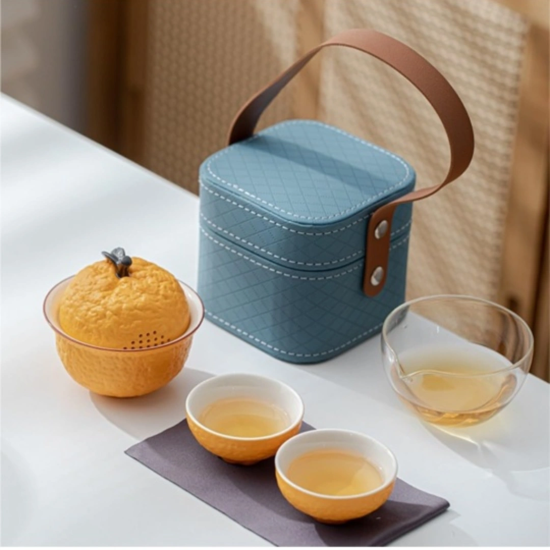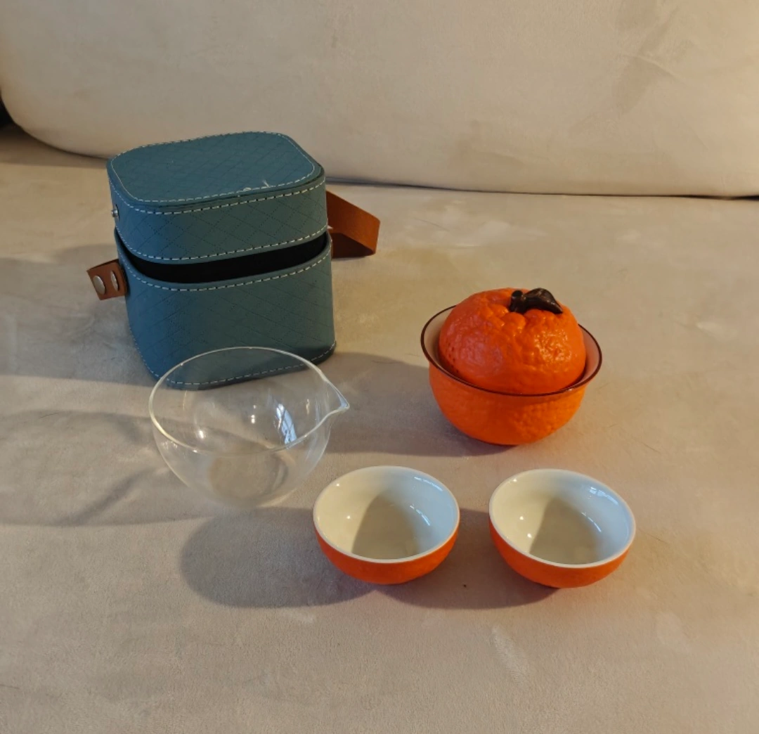 This adorable designer tea set comes with a travel case! It includes a teapot with an orange design, a pitcher, and two teacups. Perfect for tea on the go! Never used. retails for $100, selling for $50. comes in its original box.