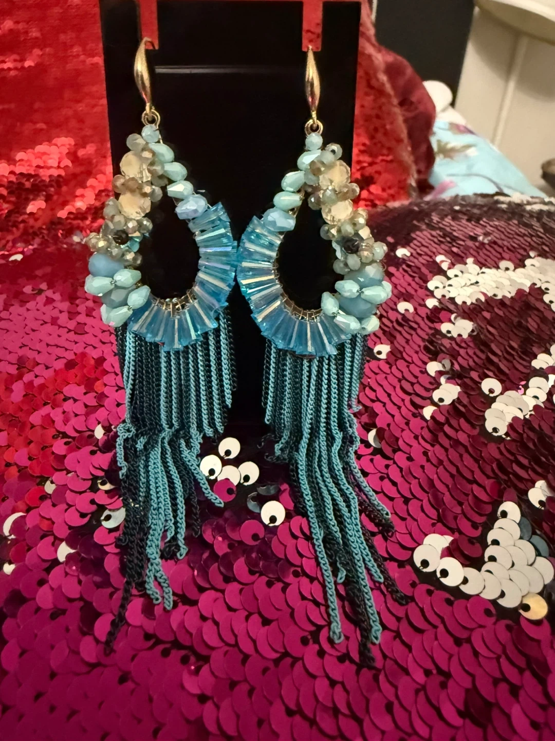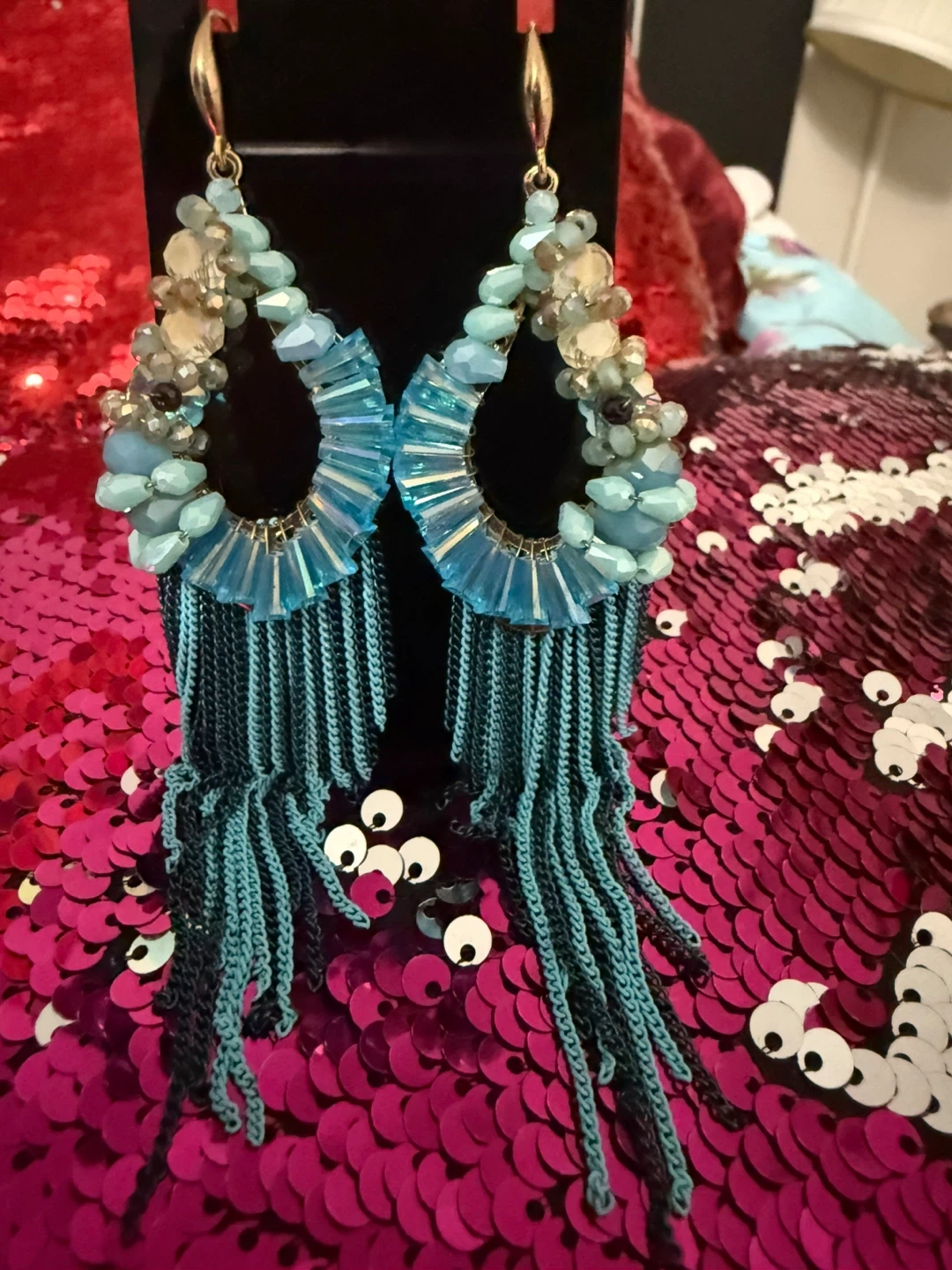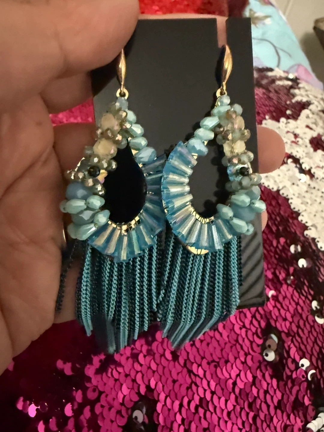 These are a pair of beautiful teal beaded dangle earrings. They feature a unique design with a mix of beads and fringe. Perfect for adding a pop of colour to any outfit!
