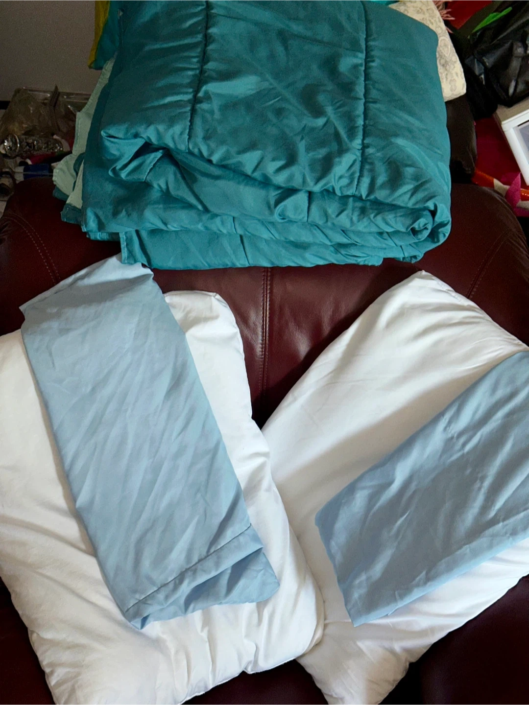 Selling a teal comforter set that includes 2 pillows + 2 pillow cases. This set is in great condition and ready to give your bedroom a fresh, cozy look. The comforter is a beautiful teal colour, is lightweight & reversible, and the pillowcases complement it perfectly. It's a great set for adding a splash of colour to your space! $25 for the set.