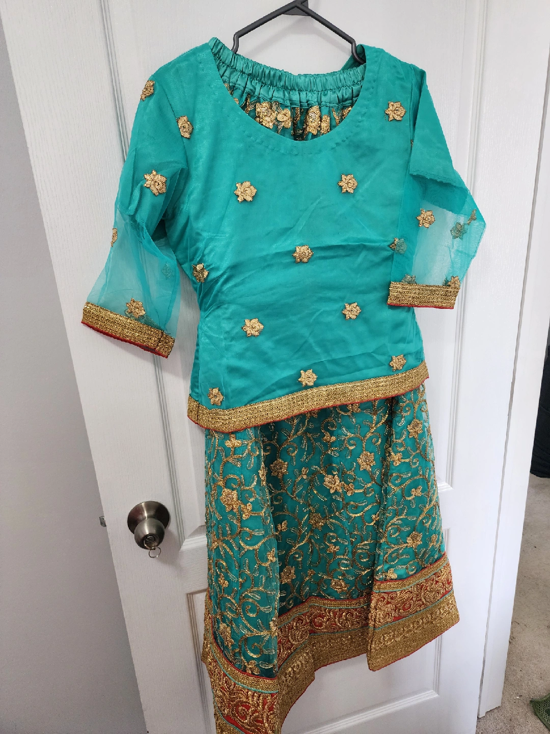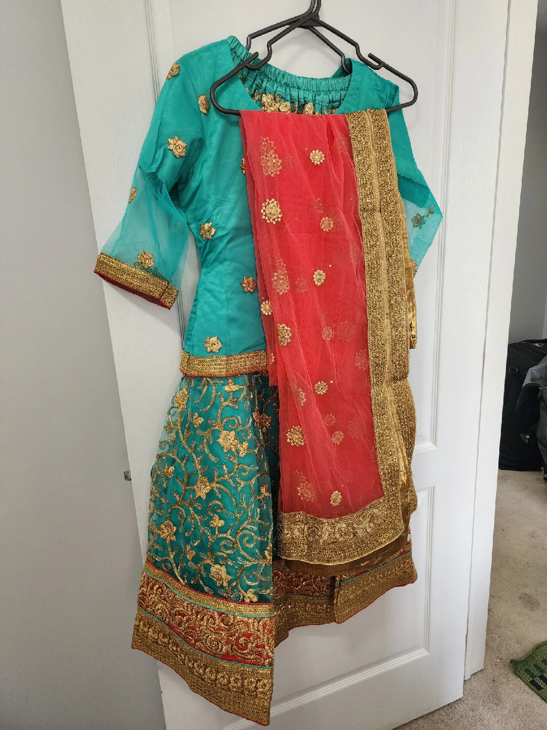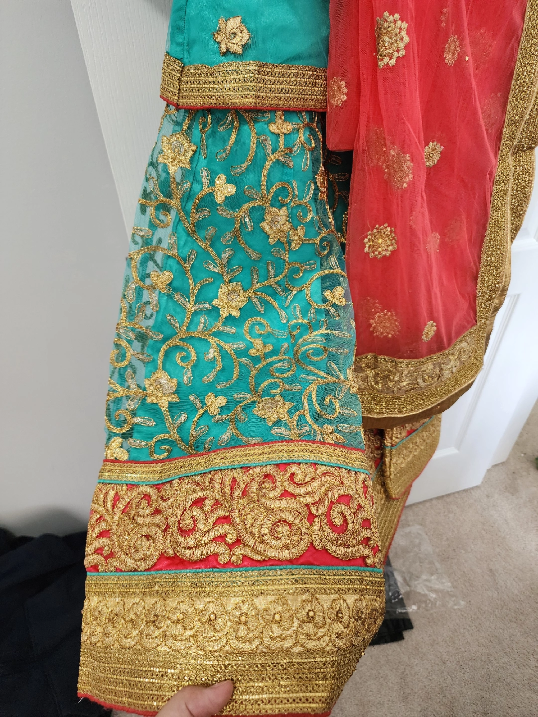 Beautiful lengha in teal and gold embroidery with a red dupatta. The intricate detailing and vibrant colours make it perfect for special occasions. It's in great condition and ready to wear!