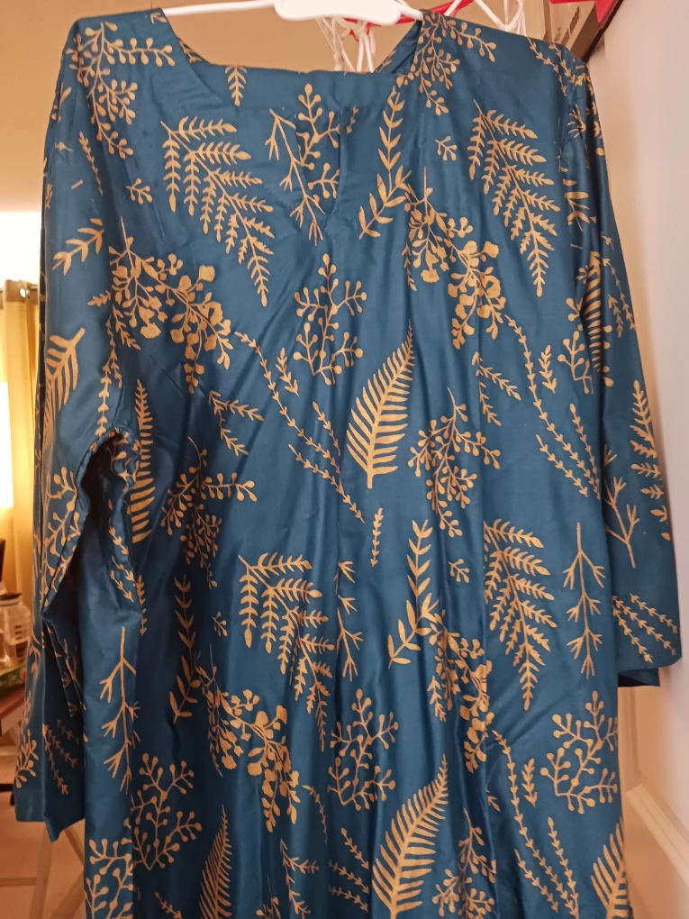 Beautiful teal dress with a gold floral print! It's in great condition and ready for a new home. The fabric feels nice and light, perfect for warmer weather or layering. The gold print really pops against the teal background, making it a unique piece