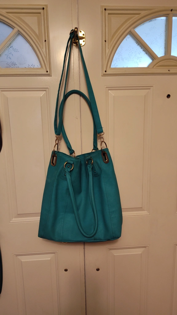 A teal Leather tote bag is up for grabs! It's in great shape and ready for a new home. The bag features gold-tone hardware and a convenient shoulder strap. Lots of convenient pouches inside. Perfect for carrying all your essentials around town! Pick up in Lisgar area of Mississauga.
