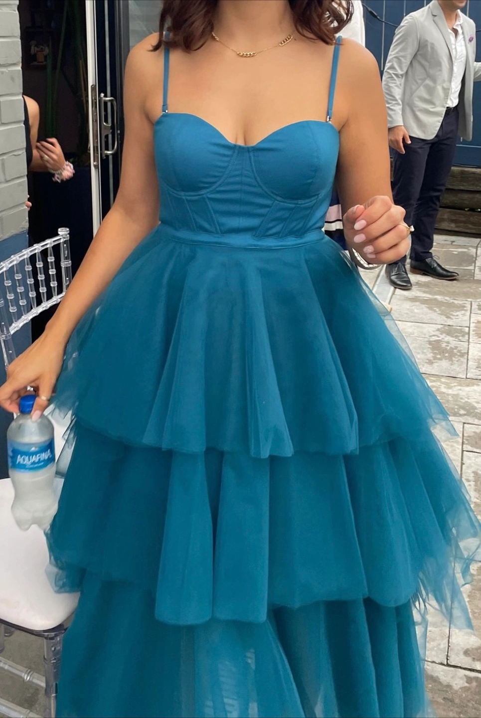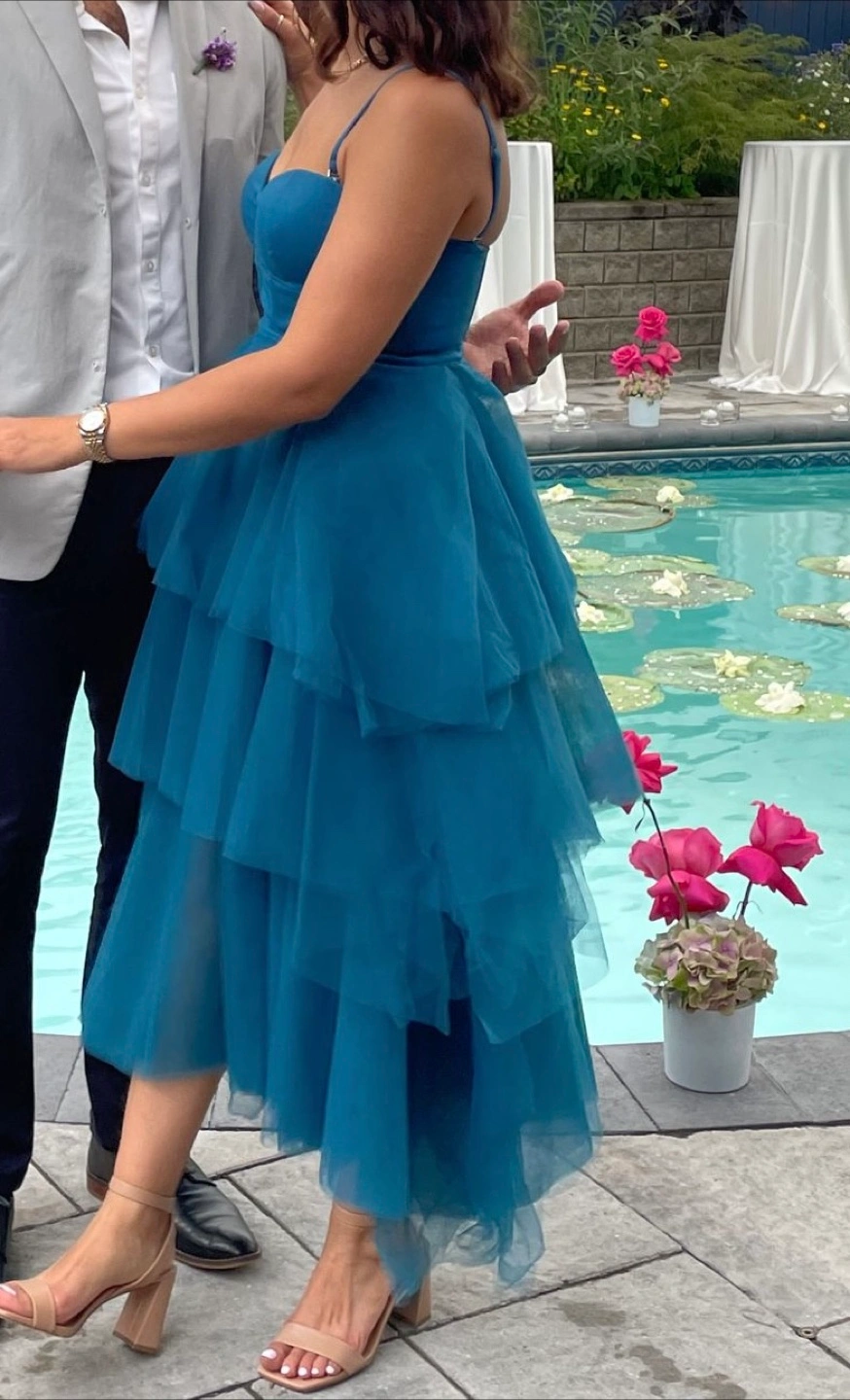 Stunning teal dress. Features a fitted bodice and a layered tulle skirt. High-low hemline. Perfect for a special occasion.vary comfortable-only wearing ones on my engagement party.