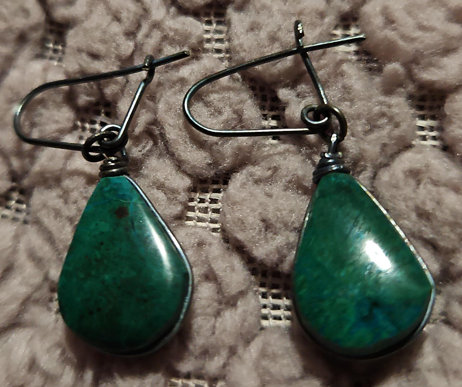 Here are some lovely teardrop earrings with a green stone. They have a unique and earthy look, perfect for adding a touch of nature to your style! The stones have a beautiful blend of greens and blues, making them really eye-catching