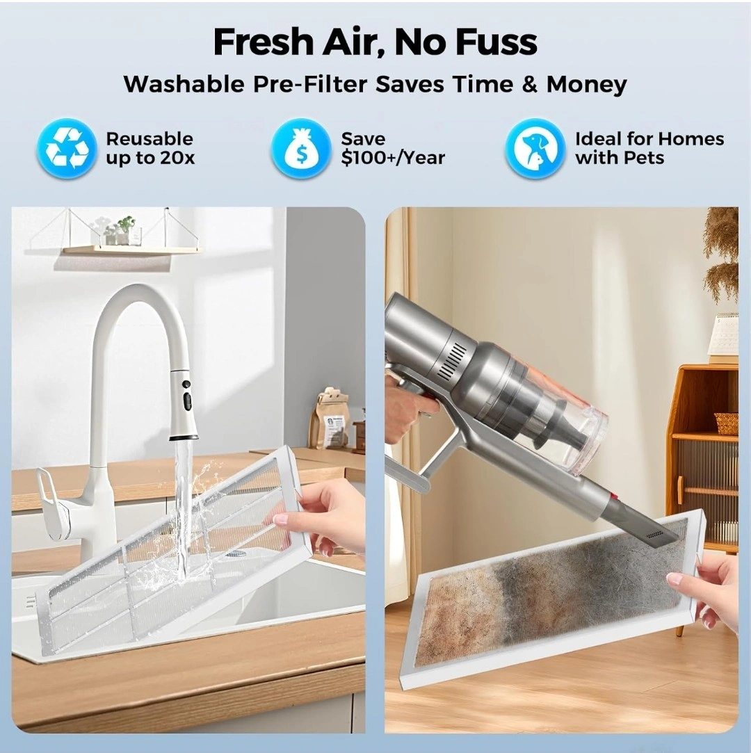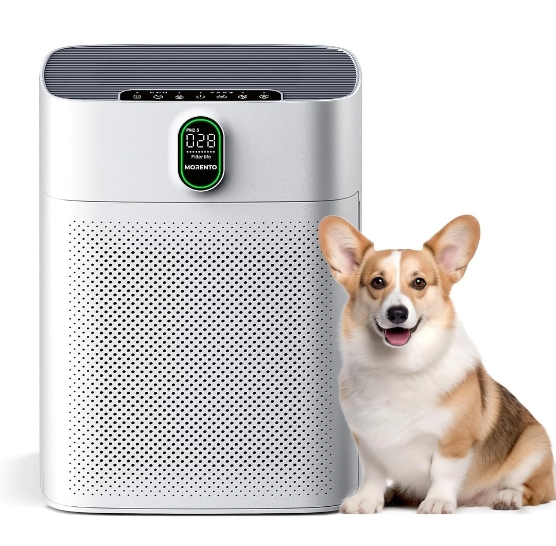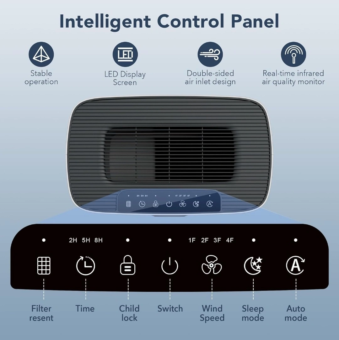 This Tebild air purifier monitors air quality in real time and automatically adjusts the fan speeds as needed. It has an intelligent control panel with features like filter reset, timer, child lock, switch, wind speed, sleep mode, and auto mode. It also has a washable pre-filter, saving you time and money