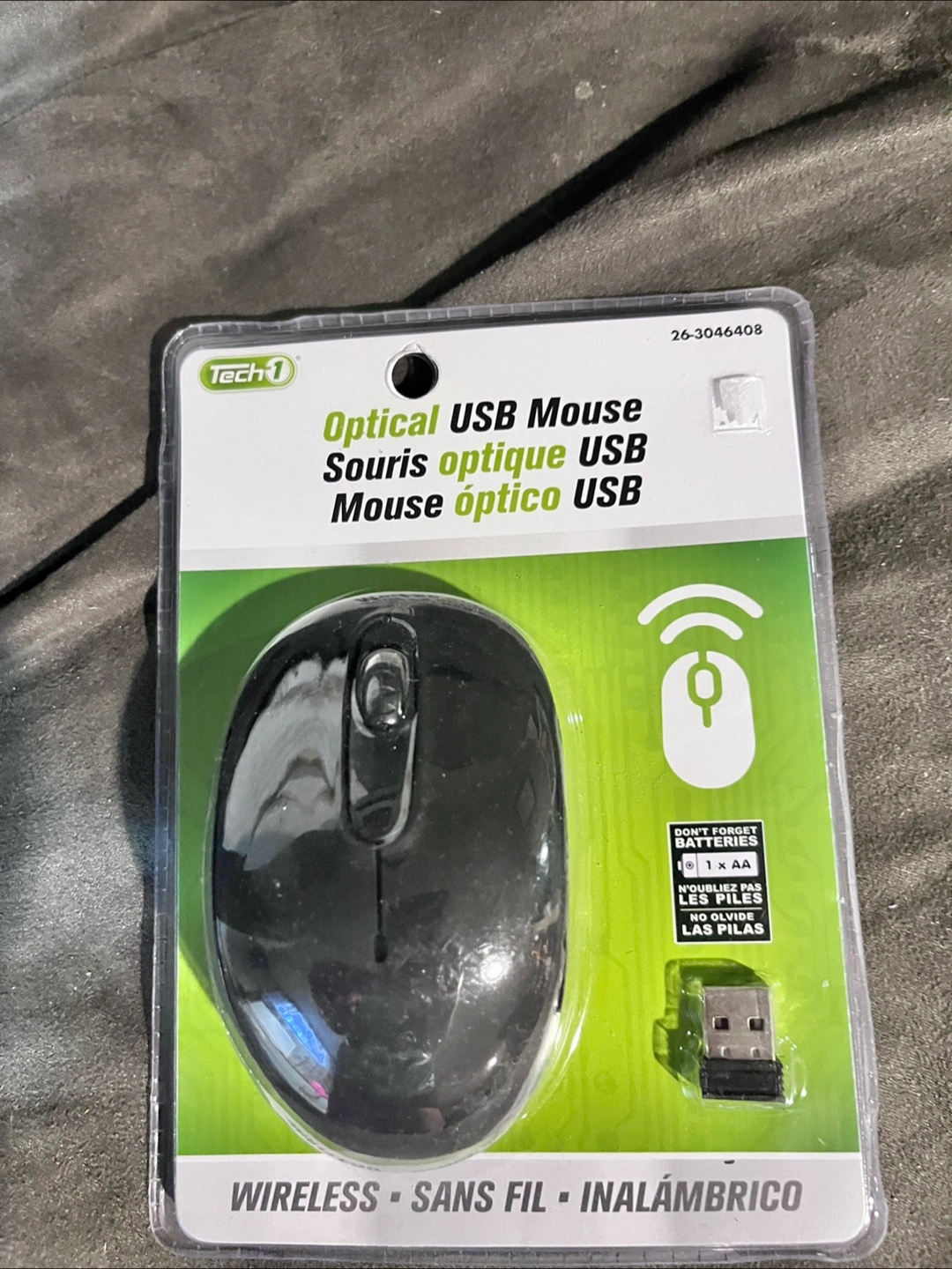 Selling a brand new Tech 1 Optical USB Mouse, still sealed in its original packaging! It's wireless and ready to use with any computer via USB. Just needs one AA battery