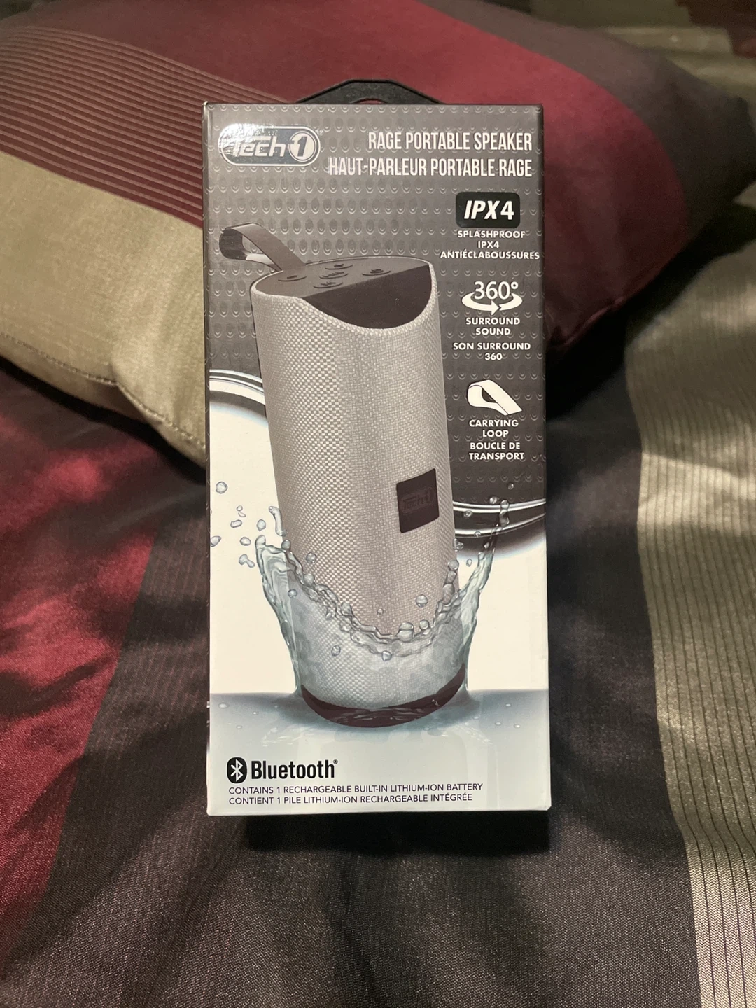 Selling a brand new Tech 1 Rage portable speaker! It's splashproof with an IPX4 rating, perfect for outdoor use. Enjoy 360° surround sound and easily carry it around with the built-in loop. It also has Bluetooth connectivity and a rechargeable lithium-ion battery. Comes in the original box!