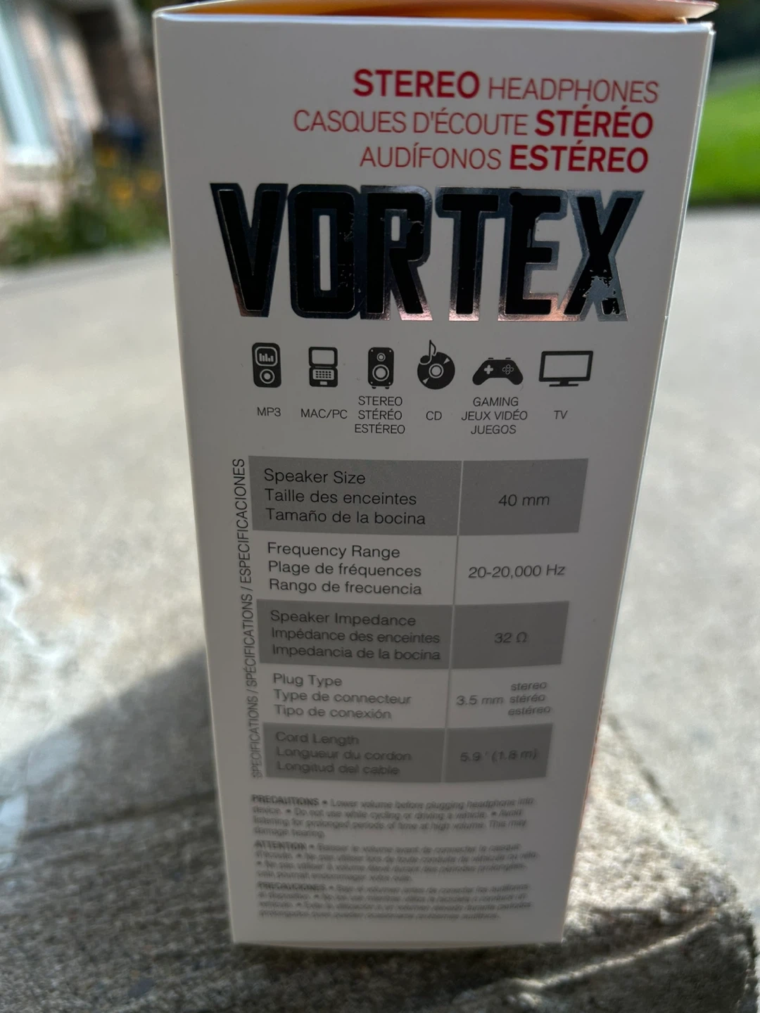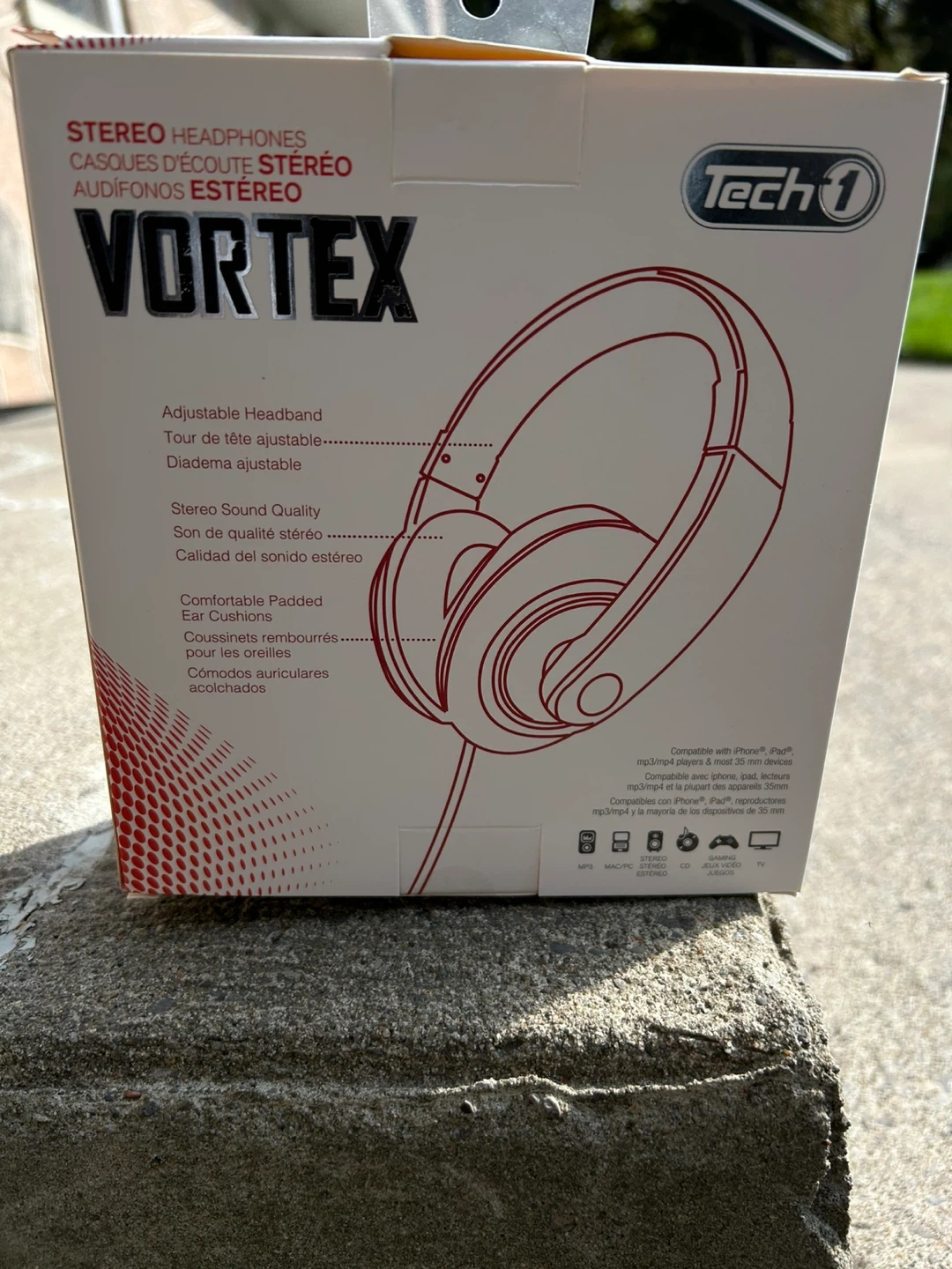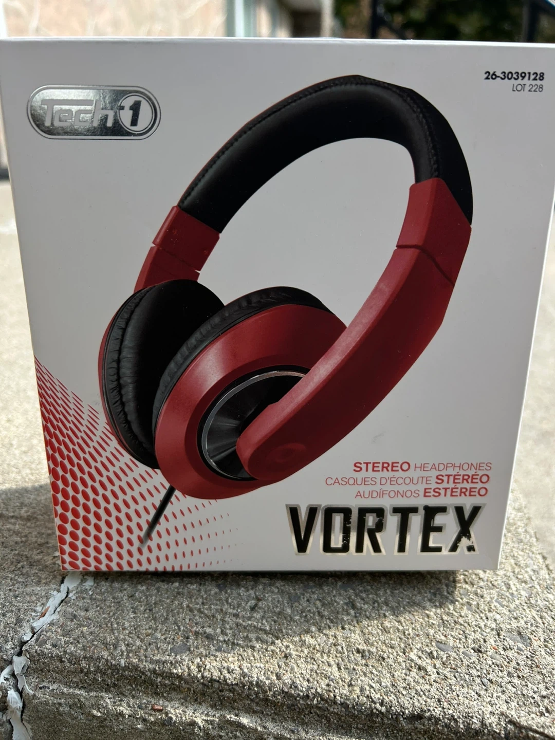 Selling a pair of Tech 1 Vortex stereo headphones. They're red and black, and come with an adjustable headband and comfortable padded ear cushions. The box includes the headphones and all original packaging. Speaker size is 40 mm, frequency range is 20-20,000 Hz, and speaker impedance is 32 Ω
