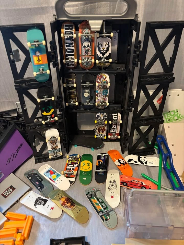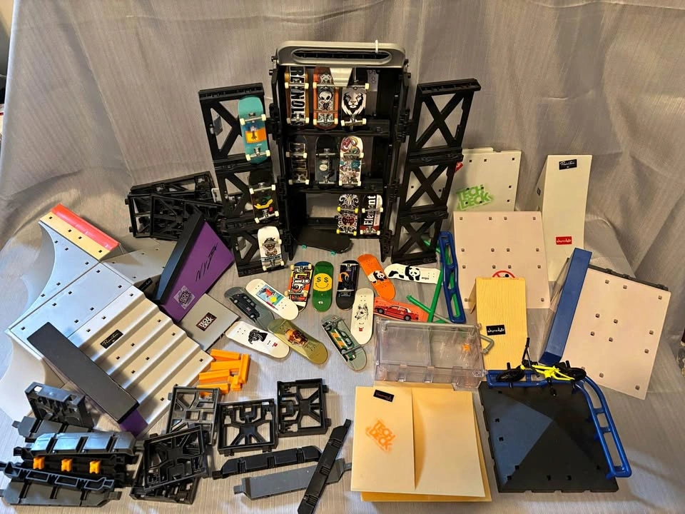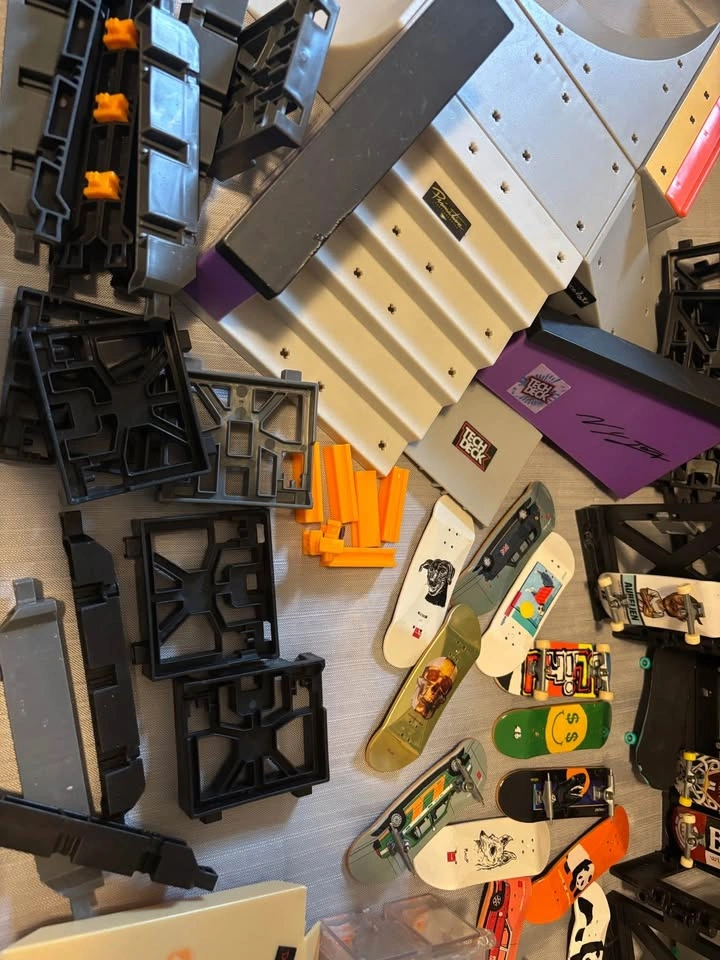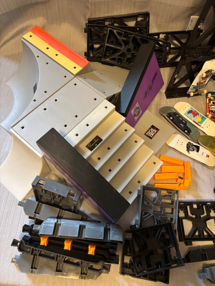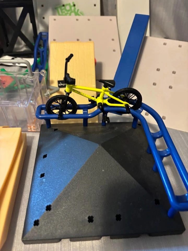 Set of ramps boards holder with built-in ramp and one bike all in good condition some have never been used comes with extra wheels and screwdrivers, etc.