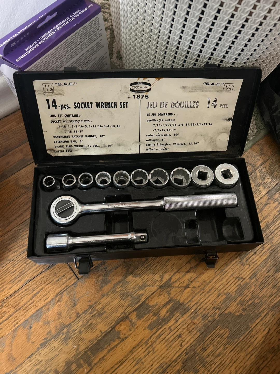Selling a TECOmaster 14-piece socket wrench set. This set contains socket wrenches (12 pts), a reversible ratchet handle (10"), an extension bar (5"), and a spark plug wrench (12 pts, 13/16"). It all comes in a metal case