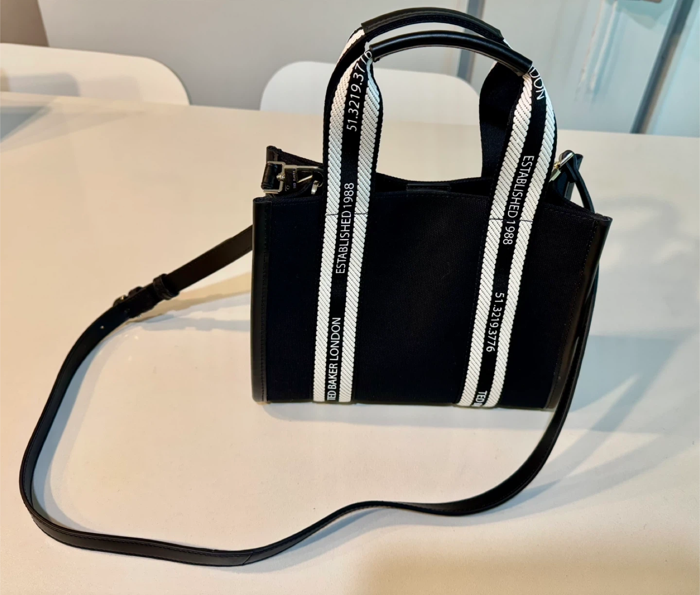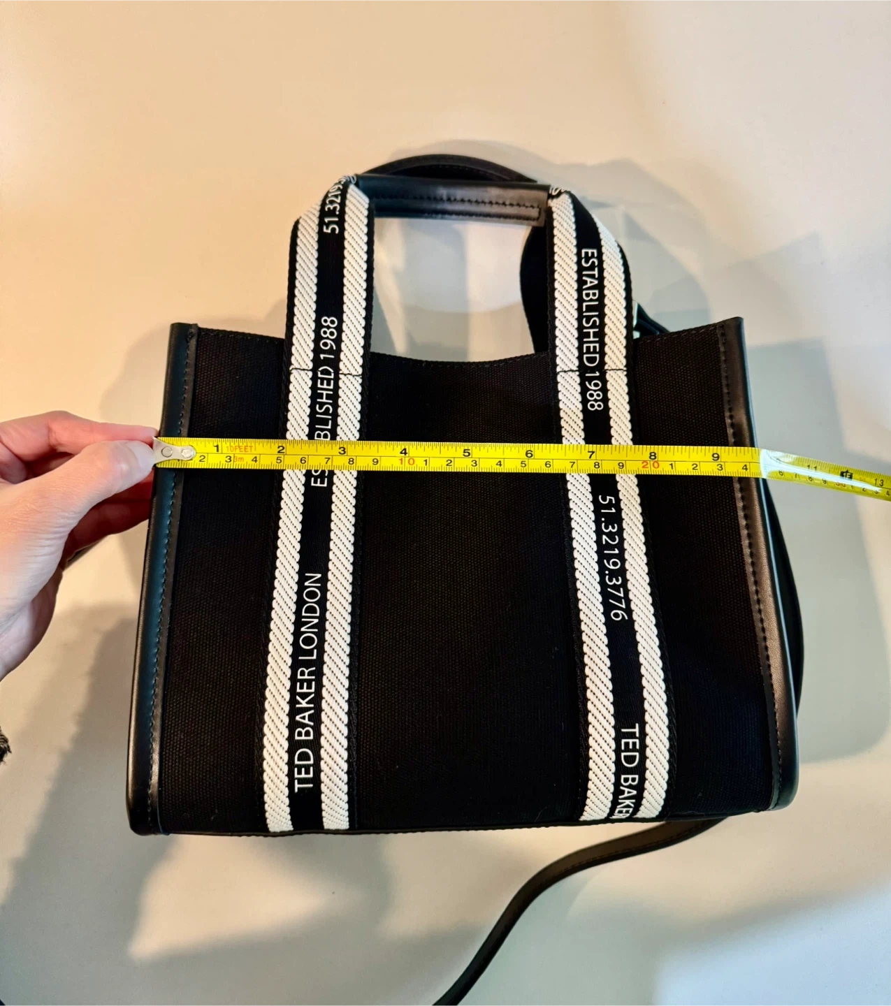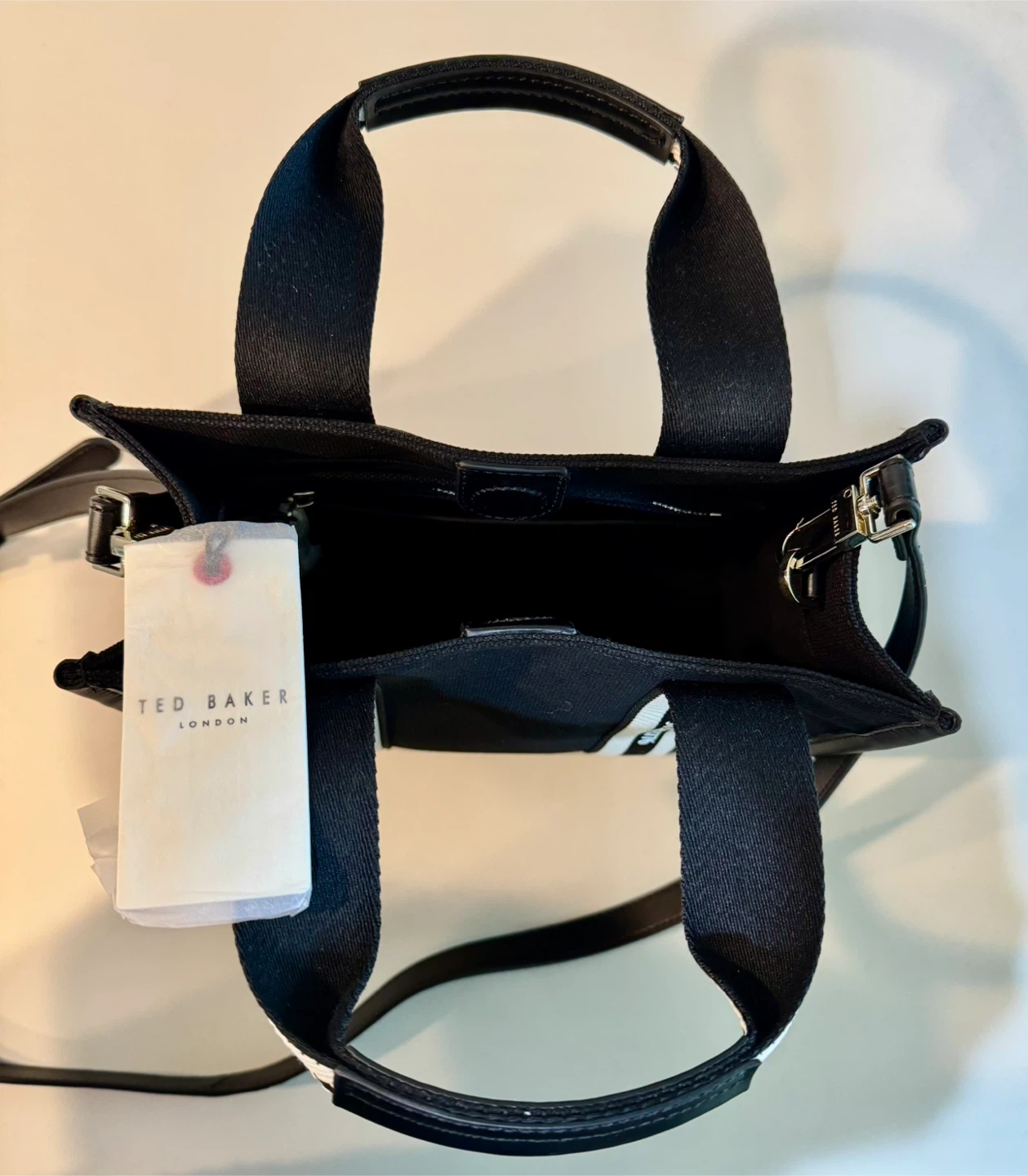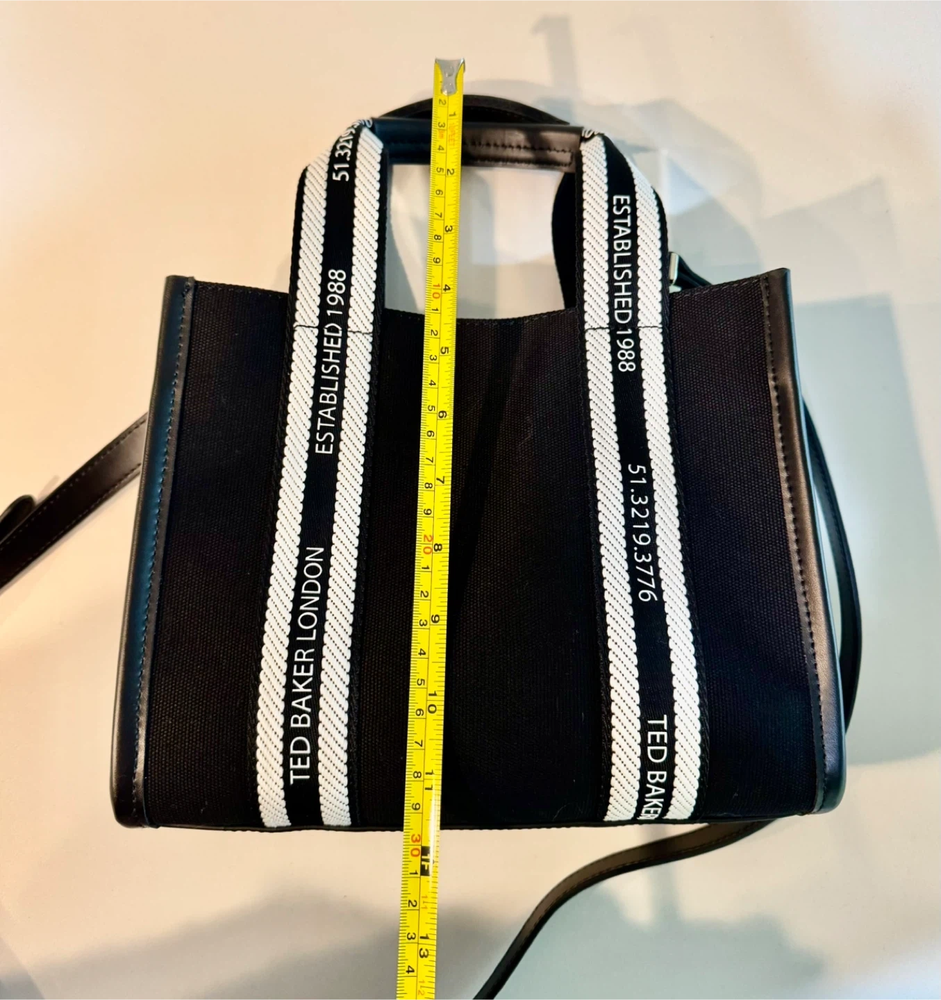 Ted Baker London Black Tote Bag_New With Tag This is a Ted Baker London tote bag in black. It features white stripes on the handles with "TED BAKER LONDON ESTABLISHED 1988 51.3219.3776" printed on them. The bag has a rectangular shape with a top handle and a detachable shoulder strap. It's in great condition and ready for a new home. Retail price : CAD $380.00