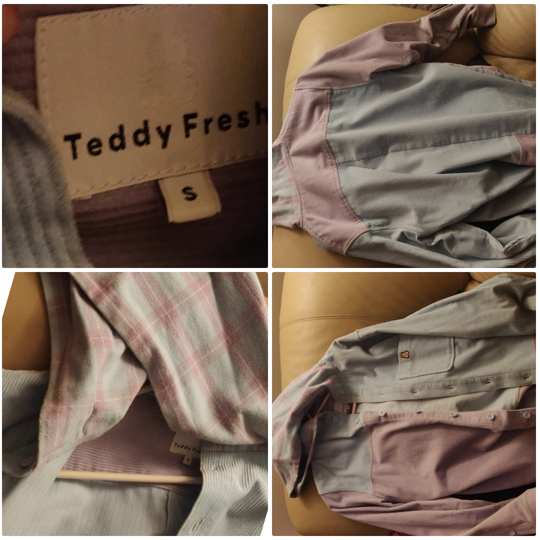 Selling a gently used Teddy Fresh colour block shirt in size small. It features a unique design with a mix of corduroy and plaid patterns. The shirt has a button-down front and a chest pocket with the Teddy Fresh logo. Great for adding a pop of colour to your wardrobe!
