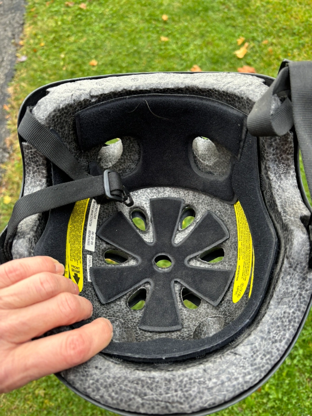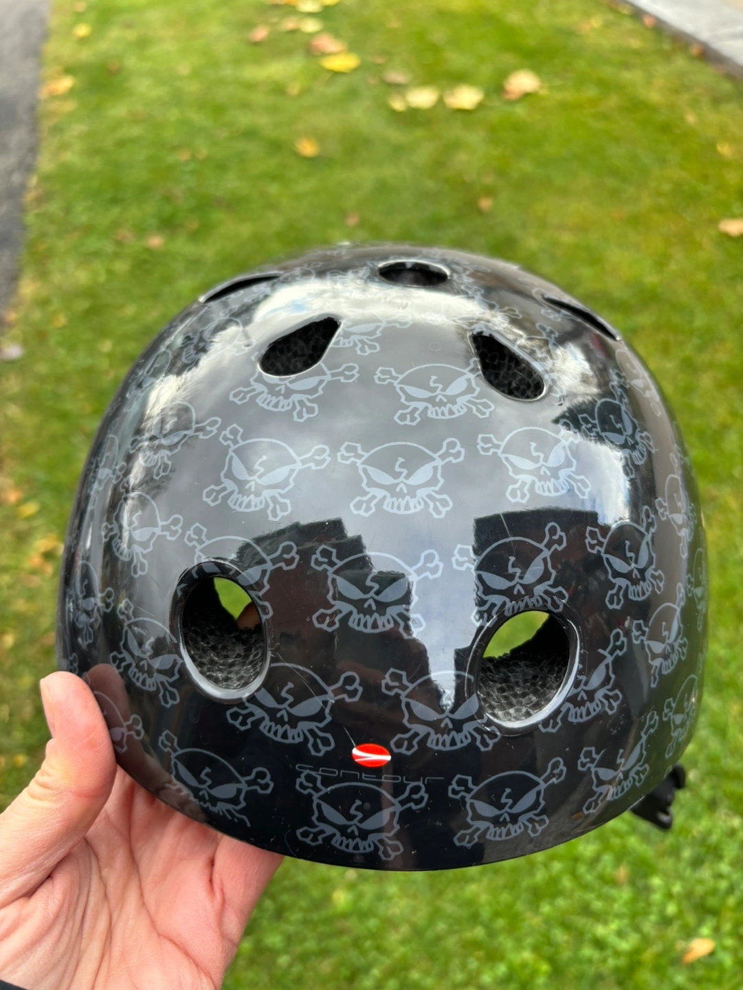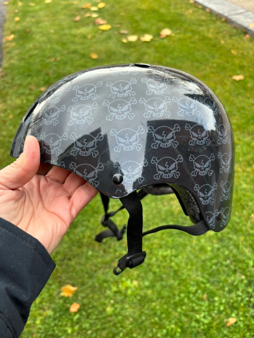 Excellent condition, only used a few times Black helmet with skull pattern. Adjustable straps. OneUp brand.