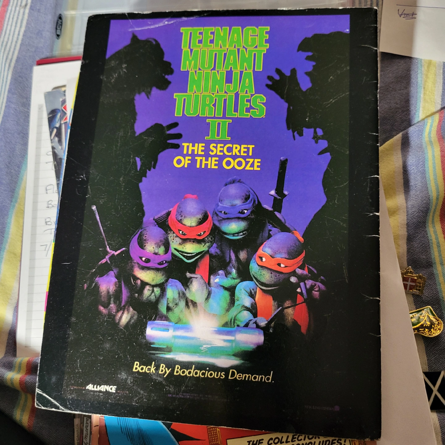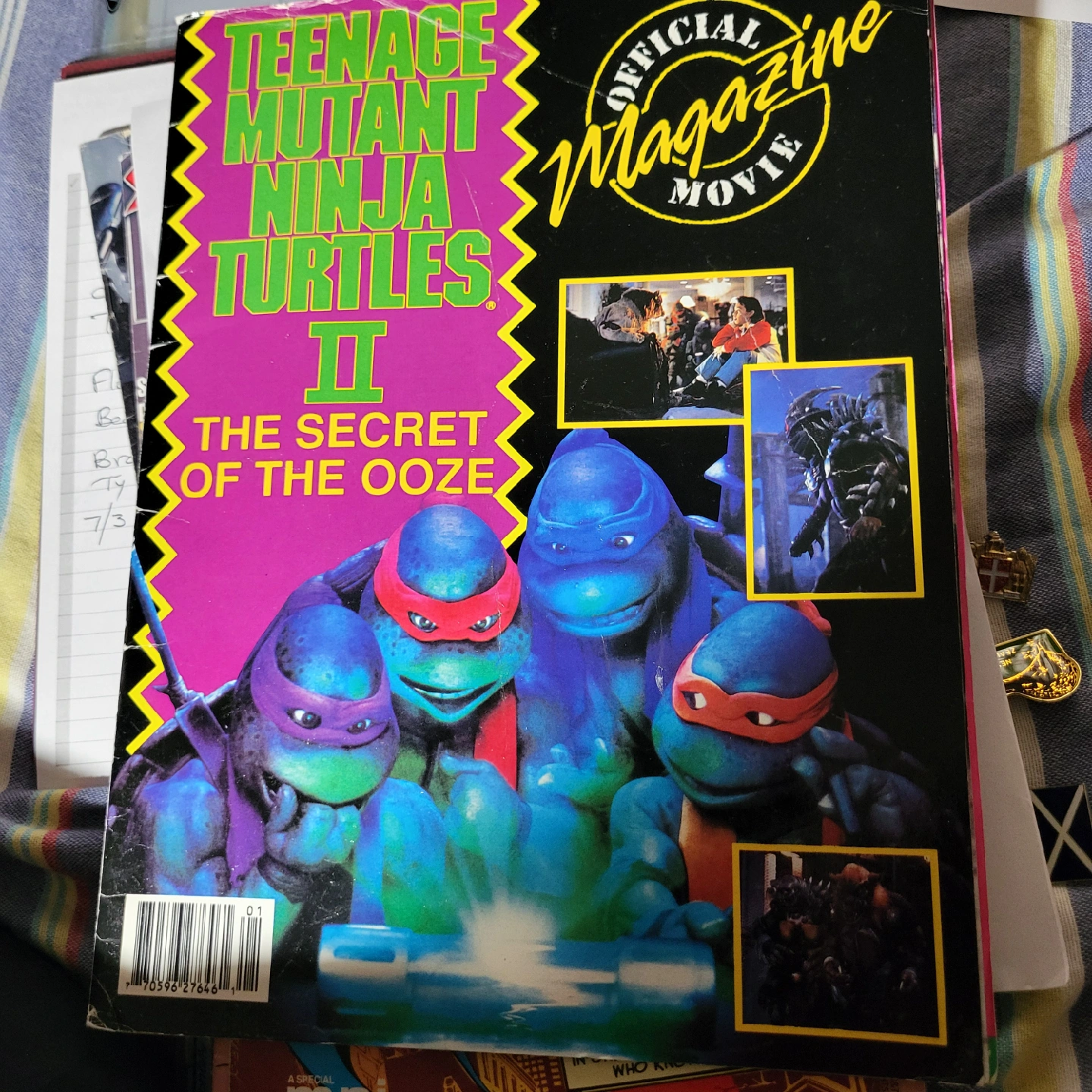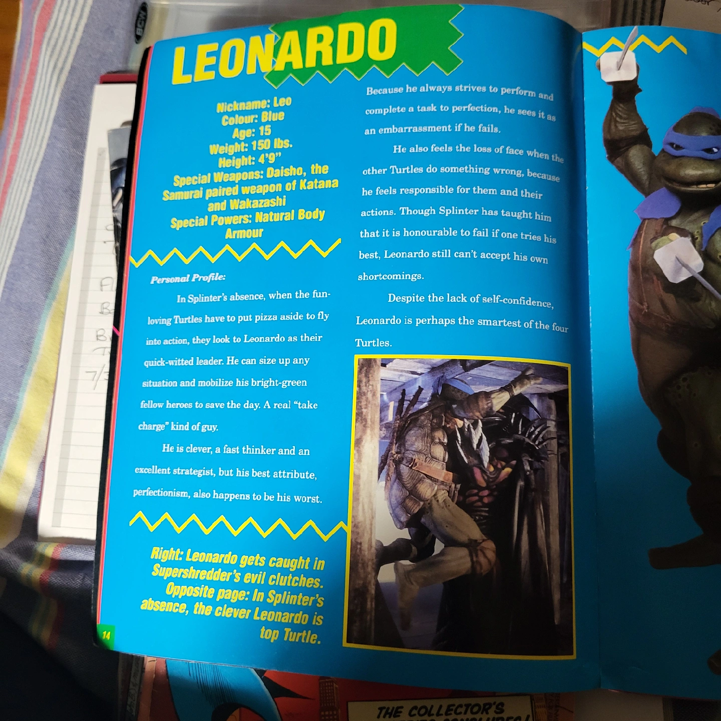 Selling a Teenage Mutant Ninja Turtles II: The Secret of the Ooze official movie magazine! It's in great shape and full of fun facts about the turtles, including Leonardo's bio: - Nickname: Leo - Colour: Blue - Age: 15 - Weight: 150 lbs - Height: 4'9"