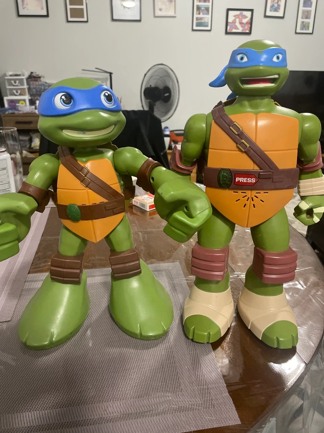 Selling two Leonardo Teenage Mutant Ninja Turtles figures. One is slightly larger and has a button that says "Press". Great for any TMNT fan!