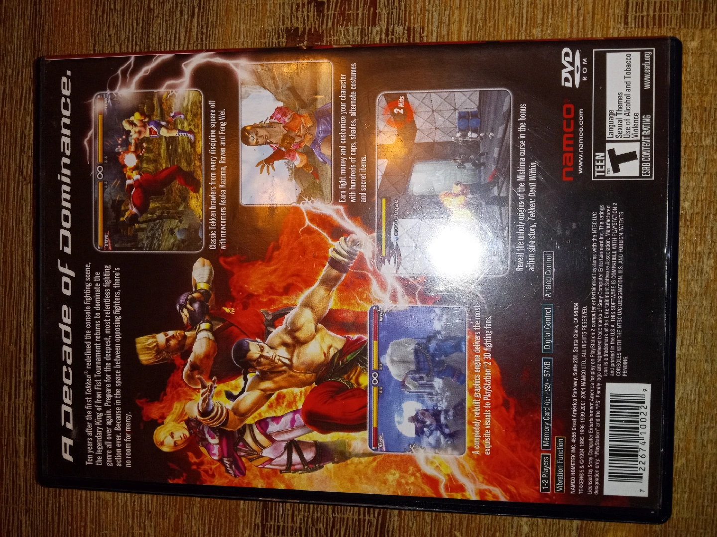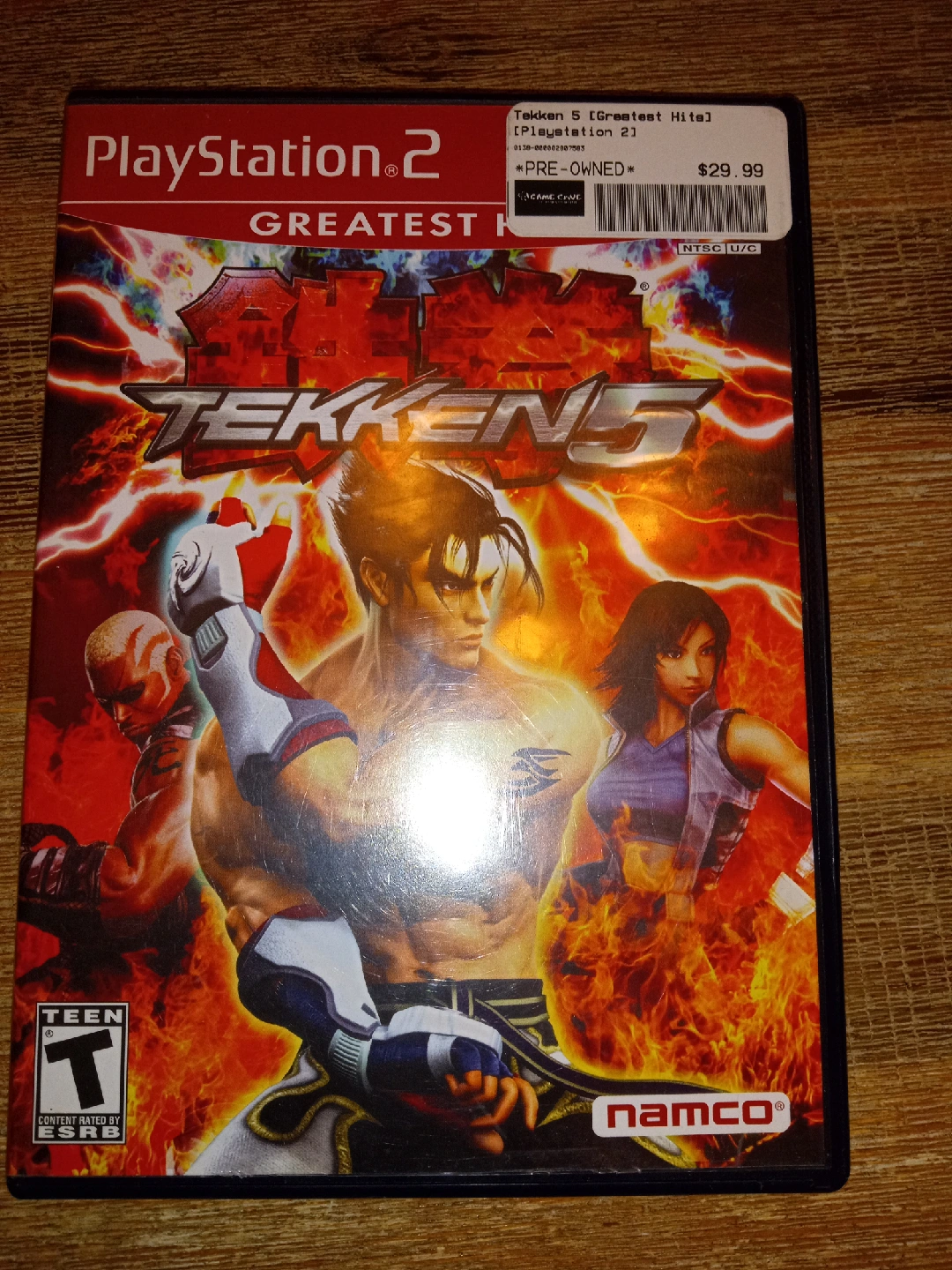 Selling Tekken 5 for the PlayStation 2! This is the Greatest Hits version. It's a complete rebuilt graphics engine, utilizes the most explicit visuals to PlayStation 2 3D fighting fans! Rated T for Teen. the disc is still in great condition with minor scratches.