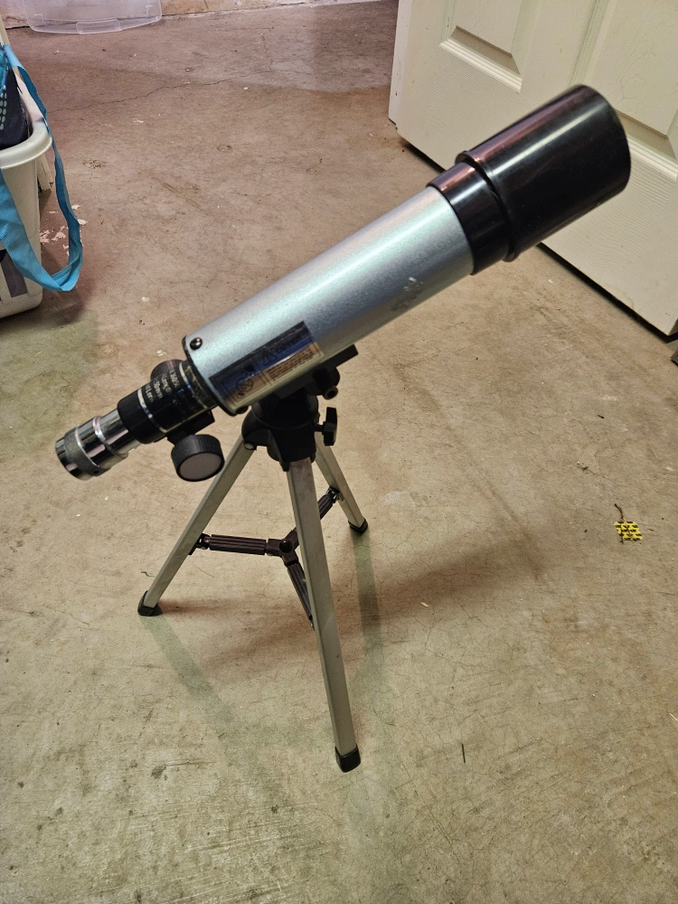 Selling a used telescope that comes with a tripod. It's in good condition and ready for some stargazing adventures!