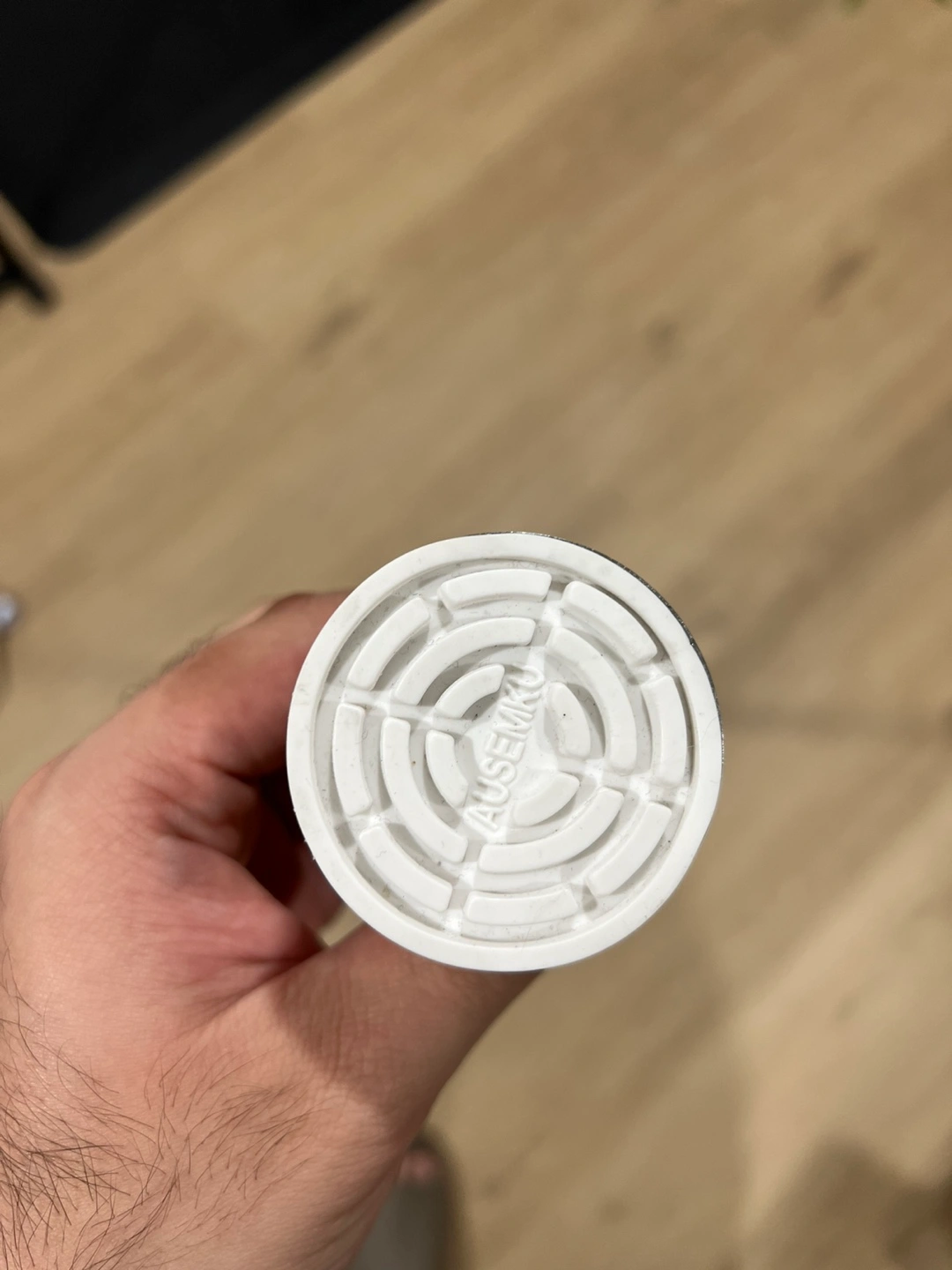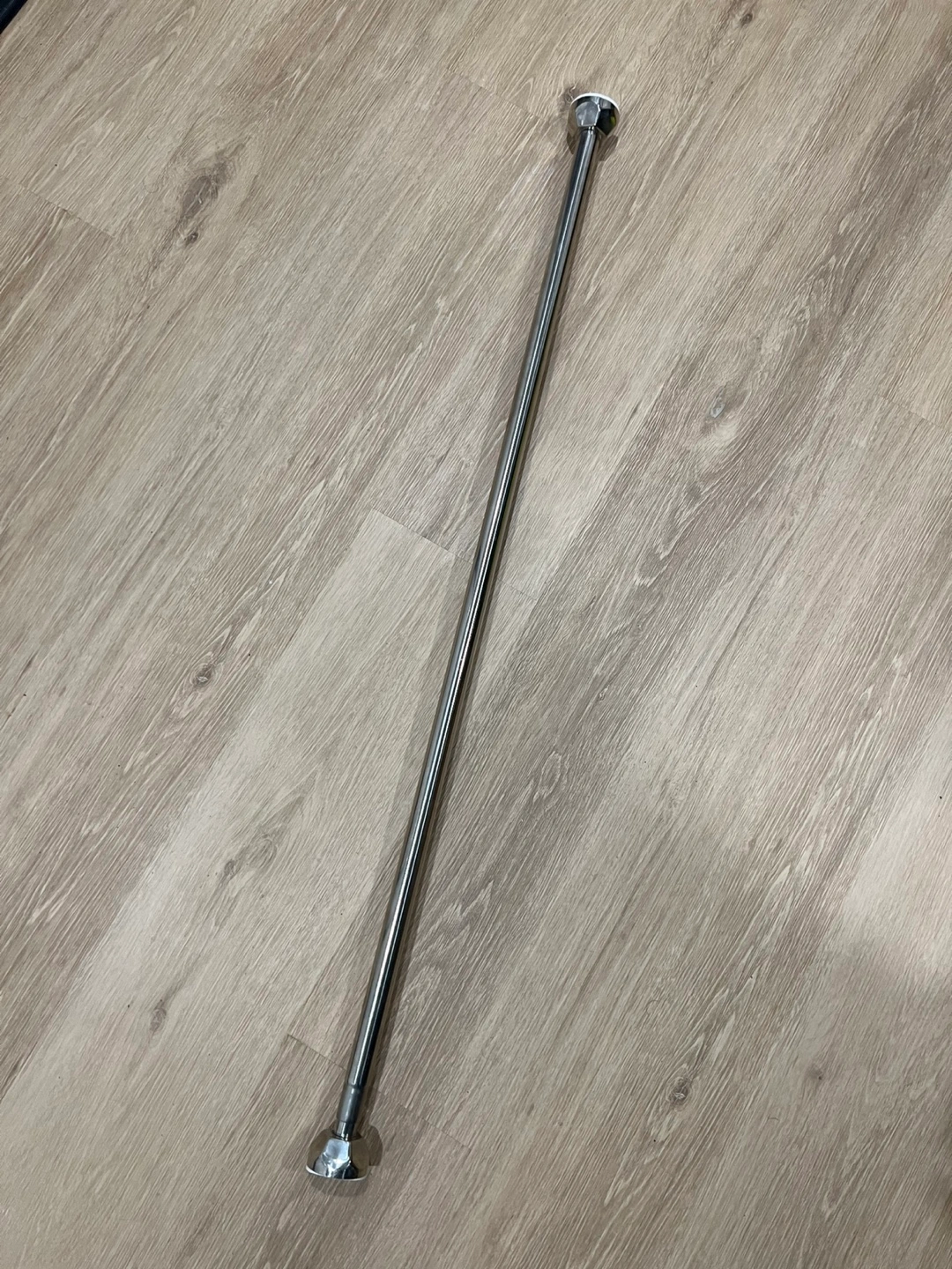 Silver telescopic shower rod. Includes end caps. Extends to about 40 inches.