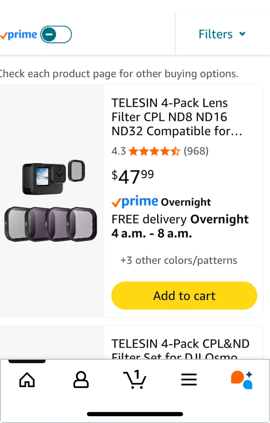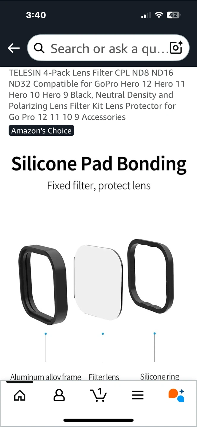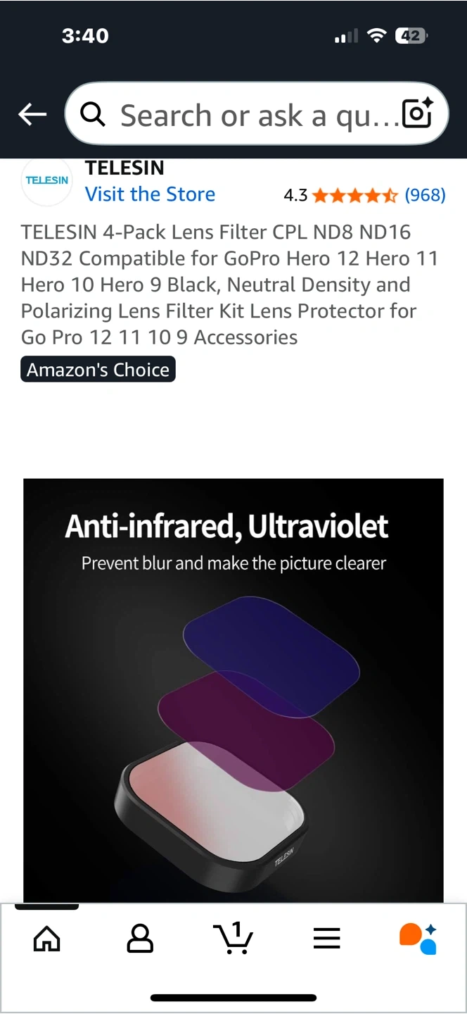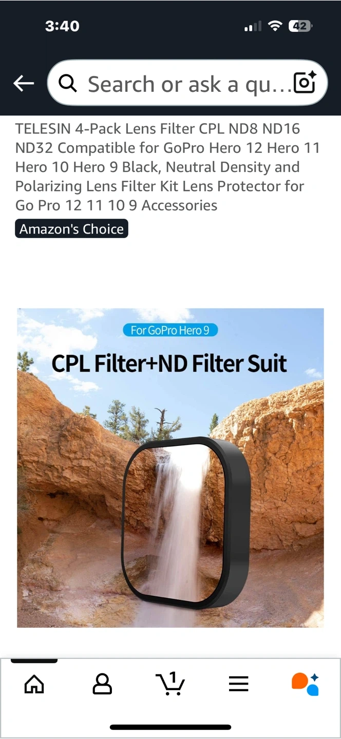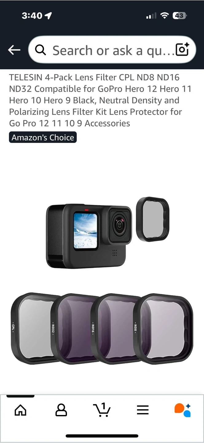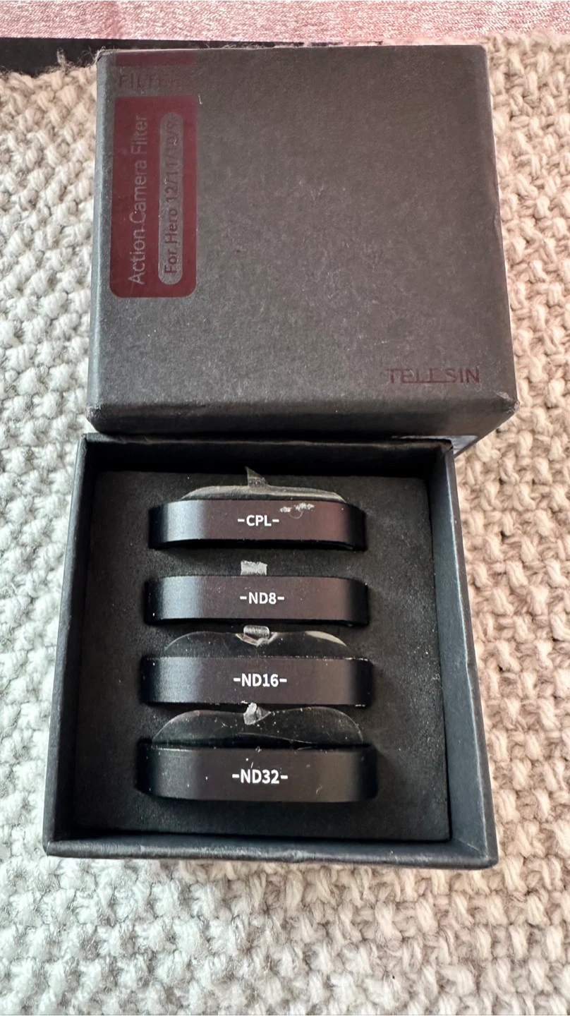 Selling a TELESIN 4-Pack Lens Filter set compatible with GoPro Hero 12, 11, 10 and 9. Includes CPL, ND8, ND16, and ND32 filters. It comes with its original box. These filters are great for capturing the best shots with your GoPro! New open box