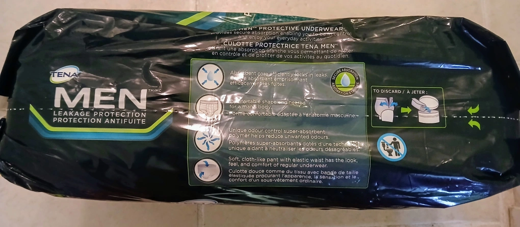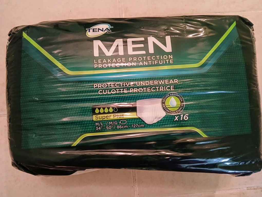 Selling a pack of Tena Men Protective Underwear, size M/L (34"-50" / 86cm-127cm). This package contains 16 protective underwear. They provide secure absorption and odour control, perfect for everyday activities! Soft, cloth-like pant with elastic waist has the look, feel, and comfort of regular underwear