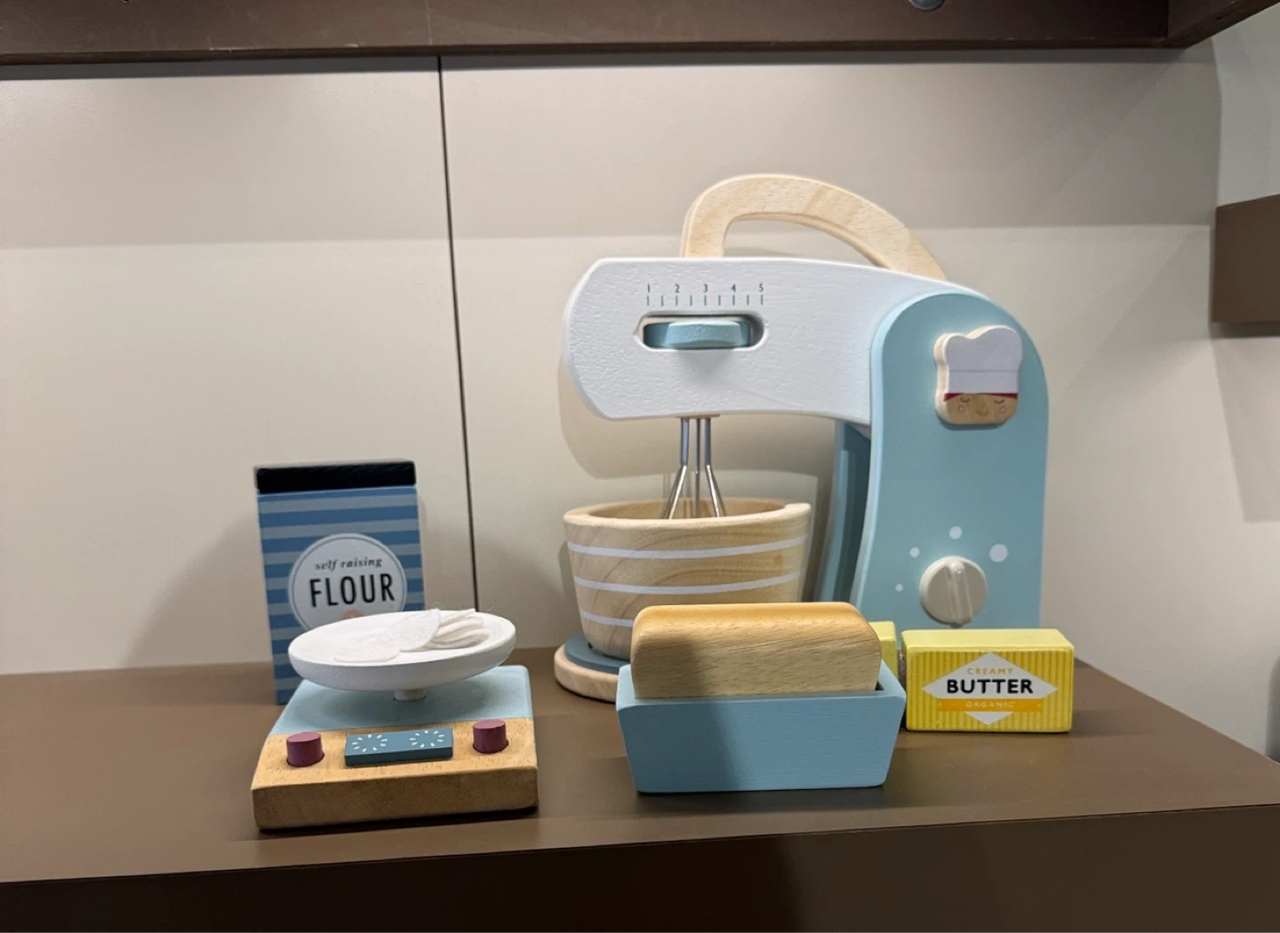 A cute wooden toy mixer set for your little one's imaginative play! Includes a mixer, flour, butter, and scale. Great for pretend baking and kitchen fun