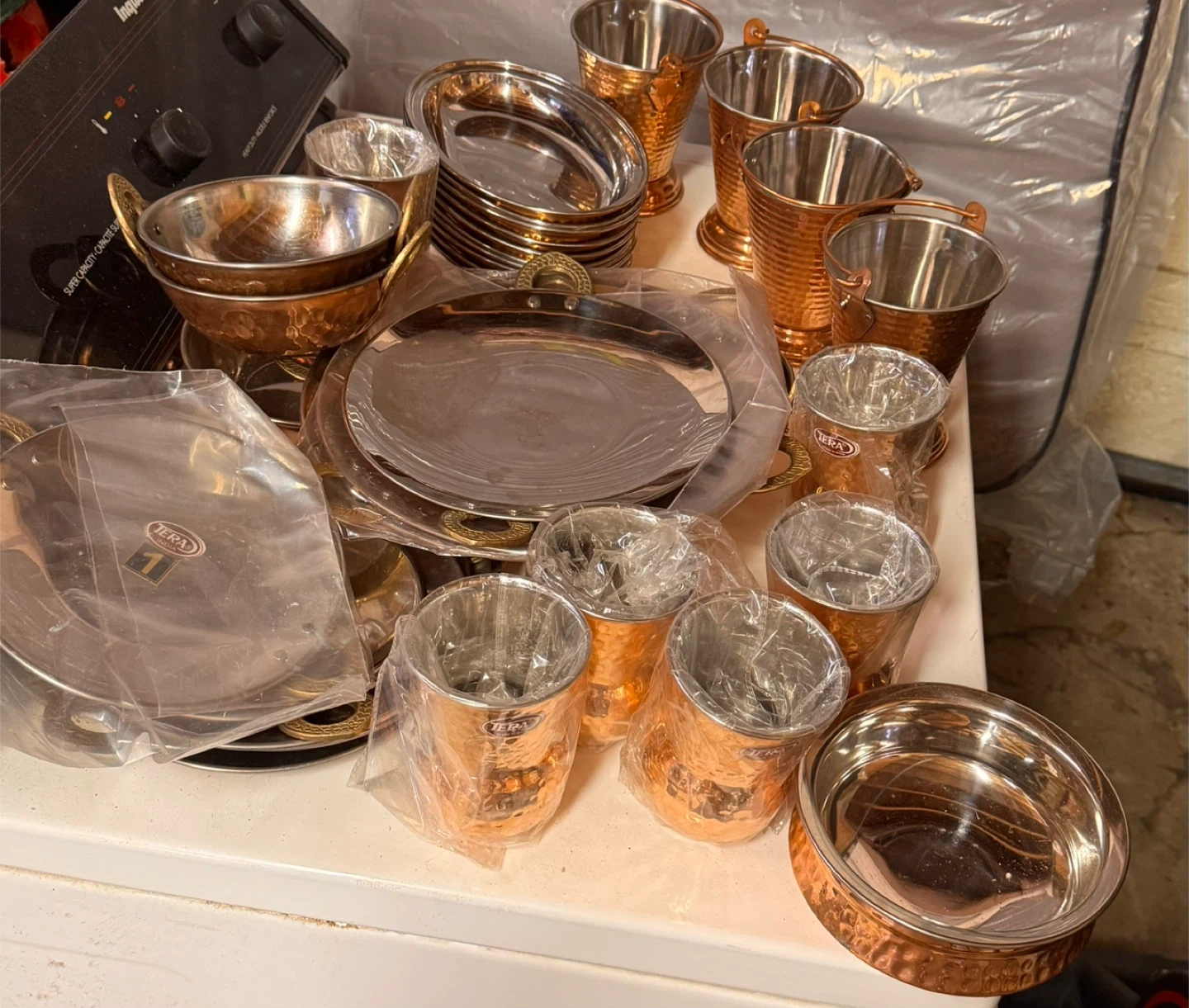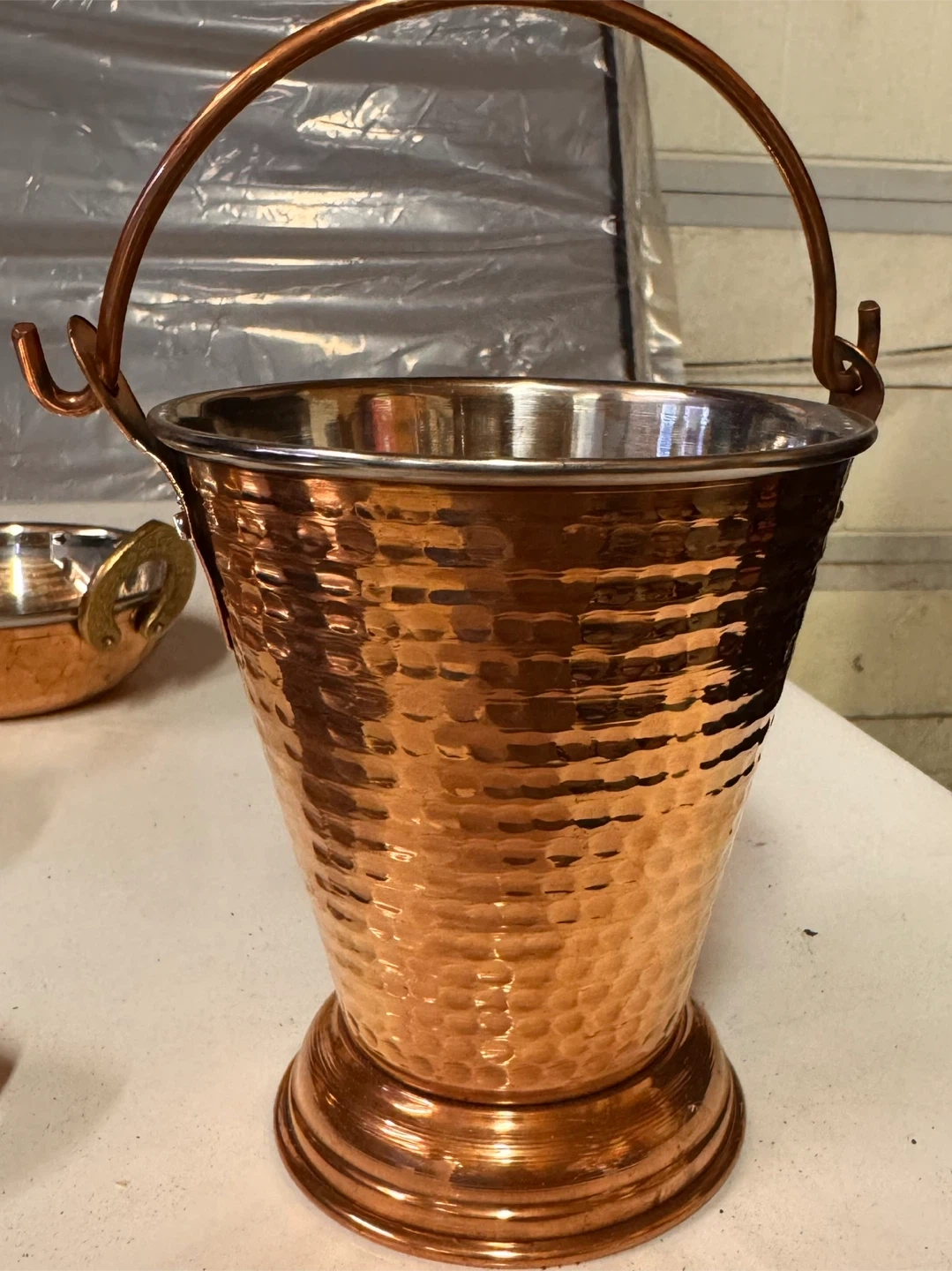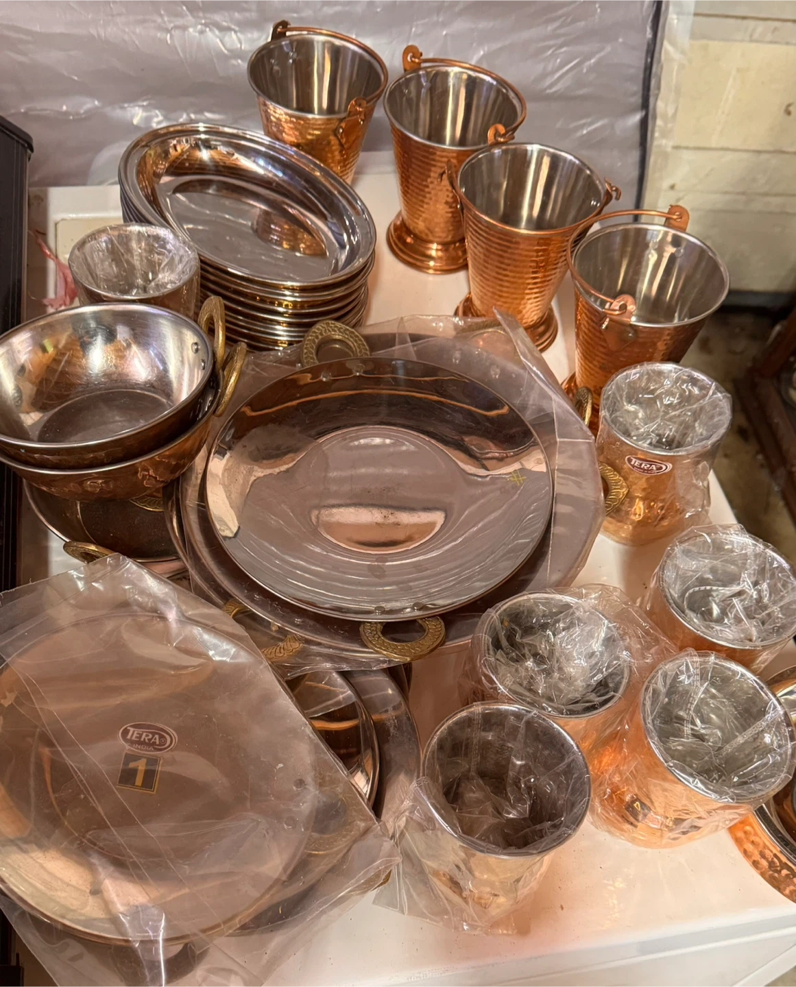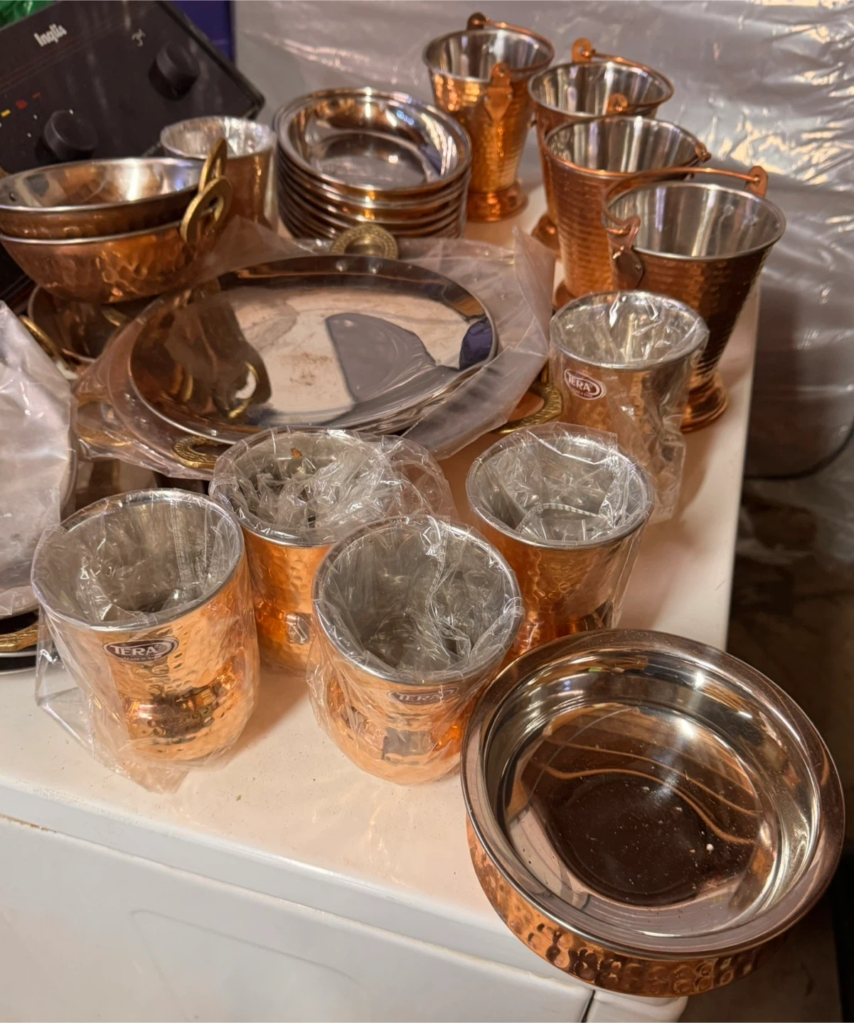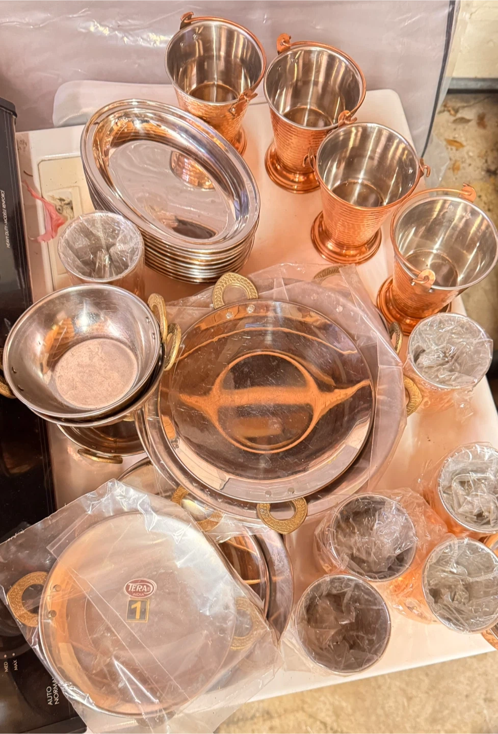 Selling a beautiful cookware set with a mix of stainless steel and copper finishes! Includes various serving plates in different sizes bowls, perfect for adding a touch of elegance to your kitchen. The set appears to be in new condition and ready for a new home! Some opened some still in packaging 4 buckets. -8 each 10 serving dishes. -8 each 16 kadhai. -12”,10”,8”,6”in size. -$8 each 1 bowl-$10 6 glasses-$50