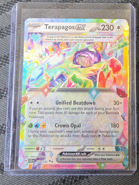 Selling a Terapagos EX Pokemon card! It has 230 HP and the attacks Unified Beatdown and Crown Opal. The card number is 128/142.