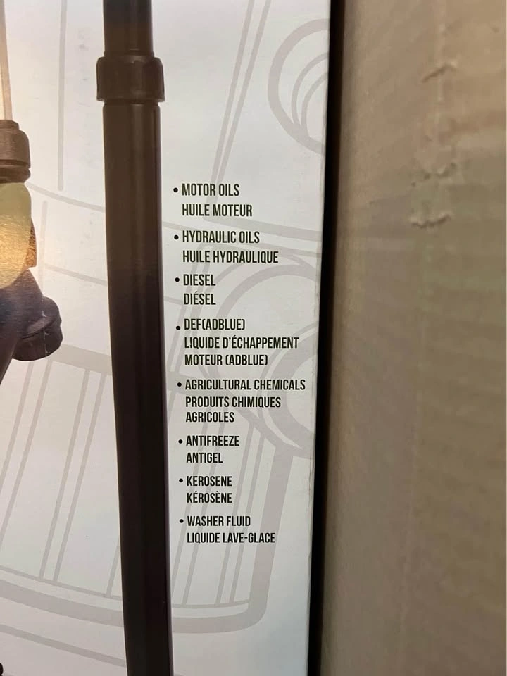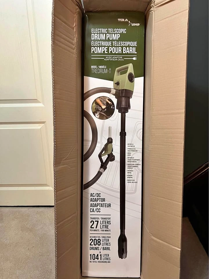 Telescopic Drum pump, good for motor oil, hydraulic oil, diesel, DEF (ADBLUE), AG chemicals, antifreeze, kerosene and washer fluid Designed for 208 L / 50 gal drum with 27 L/h transfer rate. NIB Retails for 495.00+tax See below link for more specs. https://www.terapump.net/products/tredrumt-telescopic-electric-drum-pump?srsltid=AfmBOooJJvciujDgGsjw2AsTFjoJx899aQm0LiSKOiskndi_I8IkvZcH