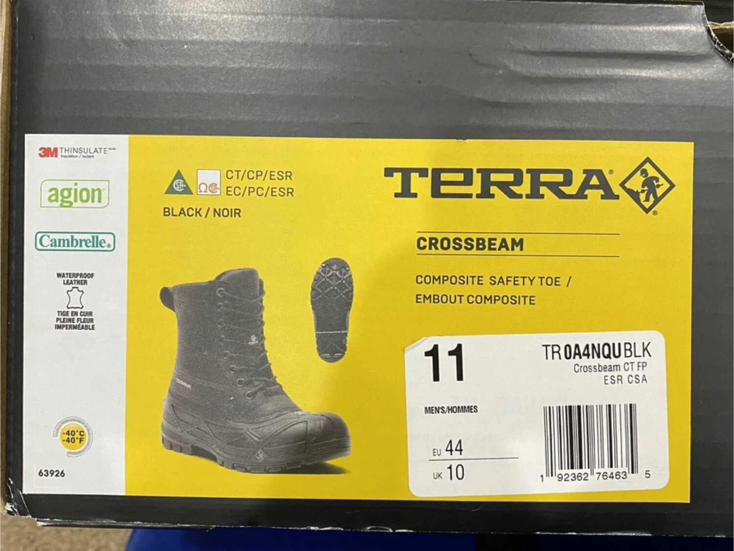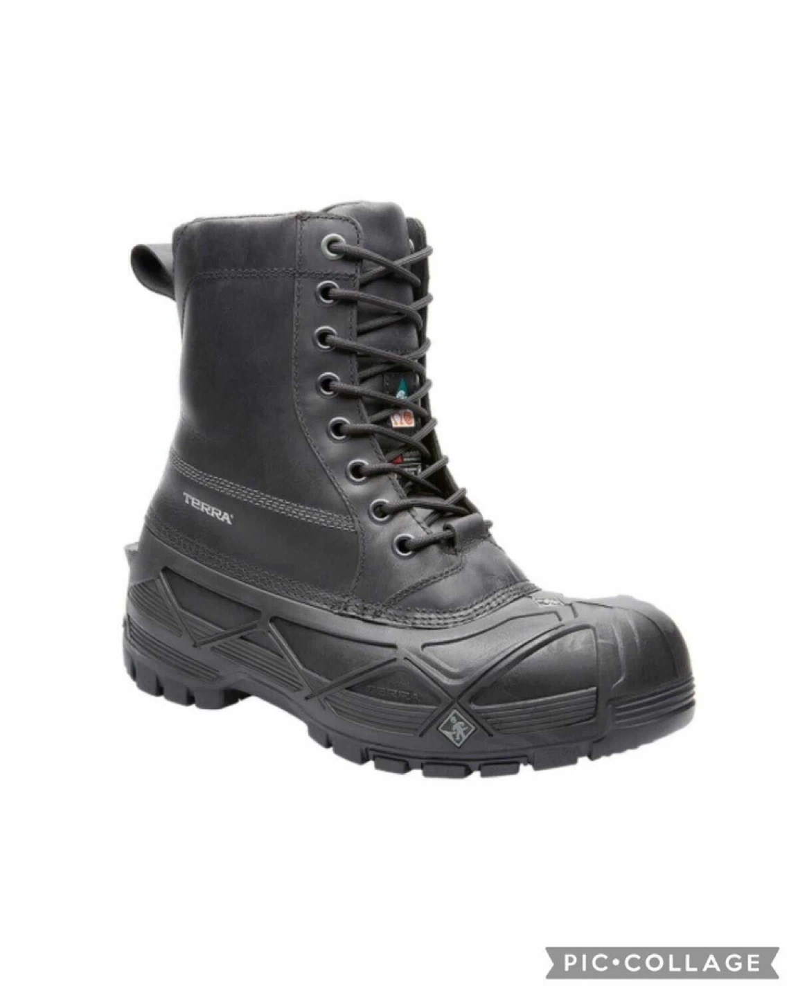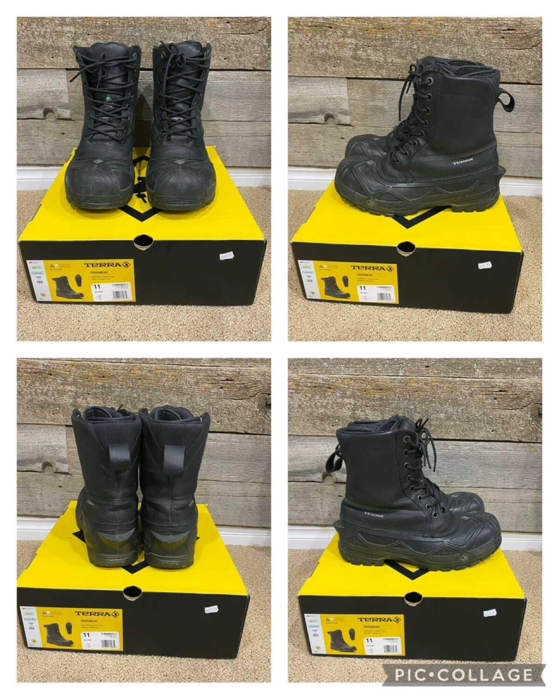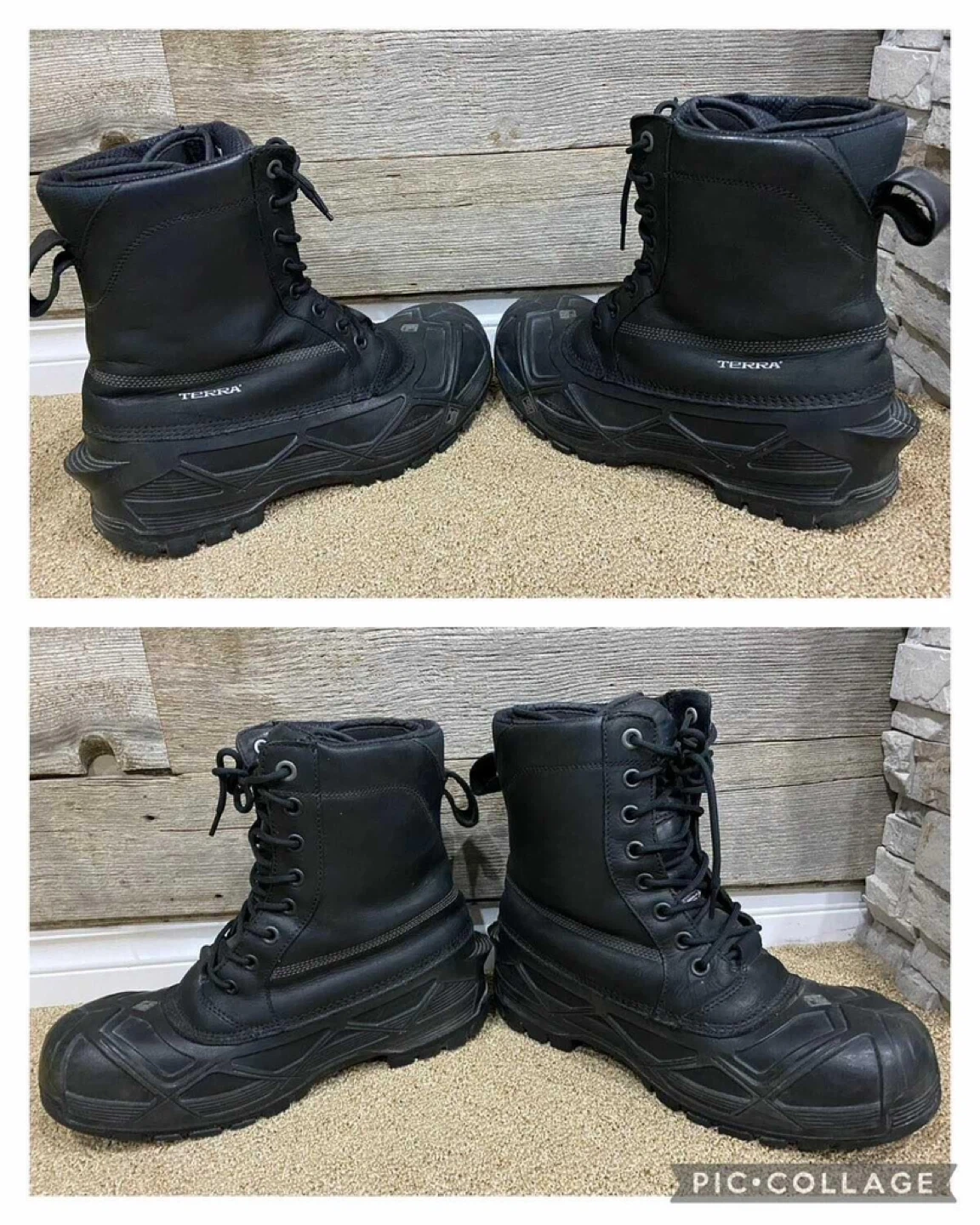 Terra Men's Composite Toe Composite Plate Crossbeam Cold Climate Work Boots Black Size 11 Frigid cold is a distraction you don’t need at work. The 3-layer lining system in the all-new Terra® Crossbeam features 400 grams of Thinsulate™ Ultra insulation to keep you warm down to -40°C/-40°F. The full-grain, water-repellent leather upper is tripple-stitched and seam-sealed to a PU shell bottom that stays flexible in extreme weather. This keeps you mobile in the cold. Protection comes from a composite toe and composite plate mounted on top of a high-traction rubber outsole with a diamond cleat pattern designed for cold-weather grip. Features Full-grain water-repellent leather upper with sealed-seams and an integrated pull tab. Removable 3-layer lining system 400g Thinsulate™ Ultra insulation High-traction, thermal-tested rubber outsole, with diamond cleat design Direct-injected, cold-formulated PU shell bottom with doffing-assist heel prong Two-layer mesh and EVA moisture capture frost plug insole CSA Grade 1 composite toe, composite plate, E.S.R. Comfort Rated -40°C/-40°F Brand new condition My teenage son wore these for his causal job at Rona last winter. Reason for selling - son quit his job Pet/ smoke free home in Parkridge Cross posted