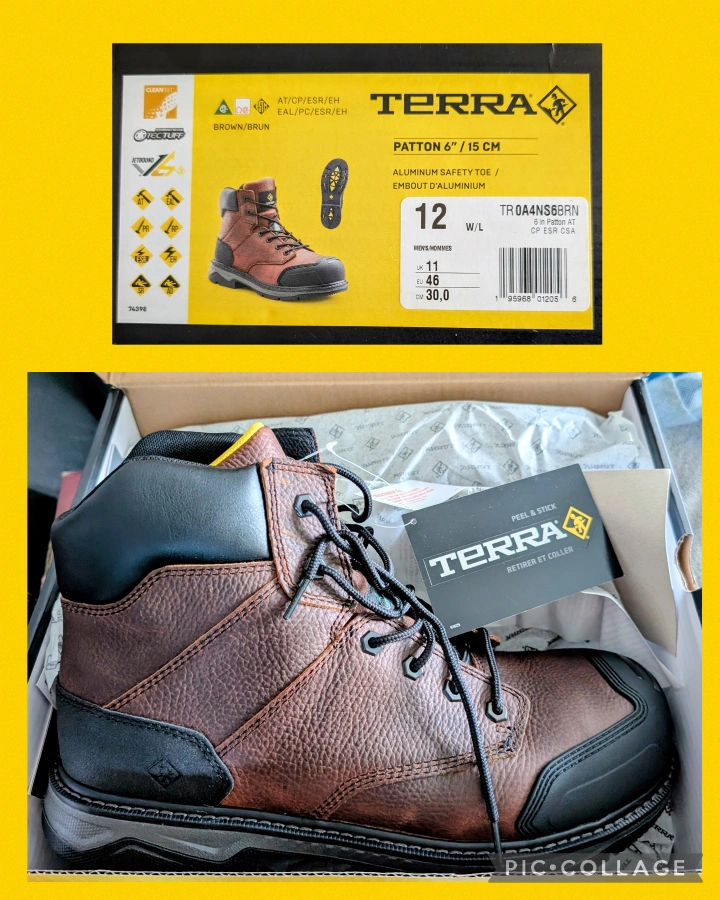 Selling a brand new pair of Terra Patton 6" safety boots in brown! These are size 12 and come in the original box. They feature an aluminum safety toe and are designed for men. Perfect for work or any situation where you need reliable foot protection!