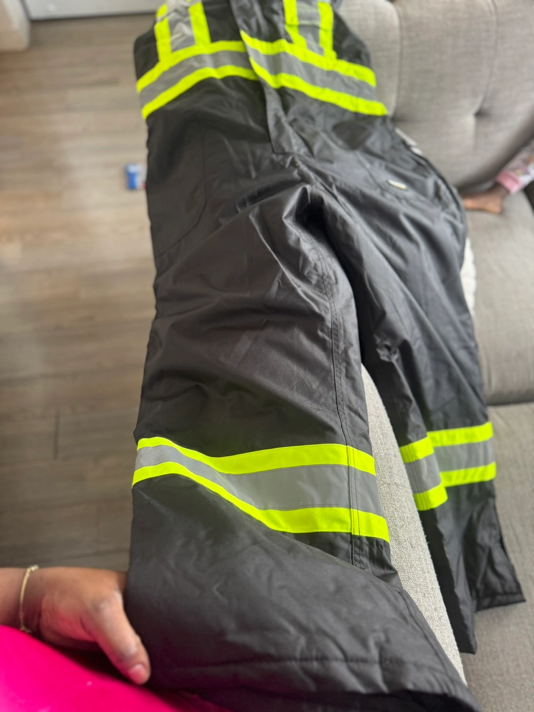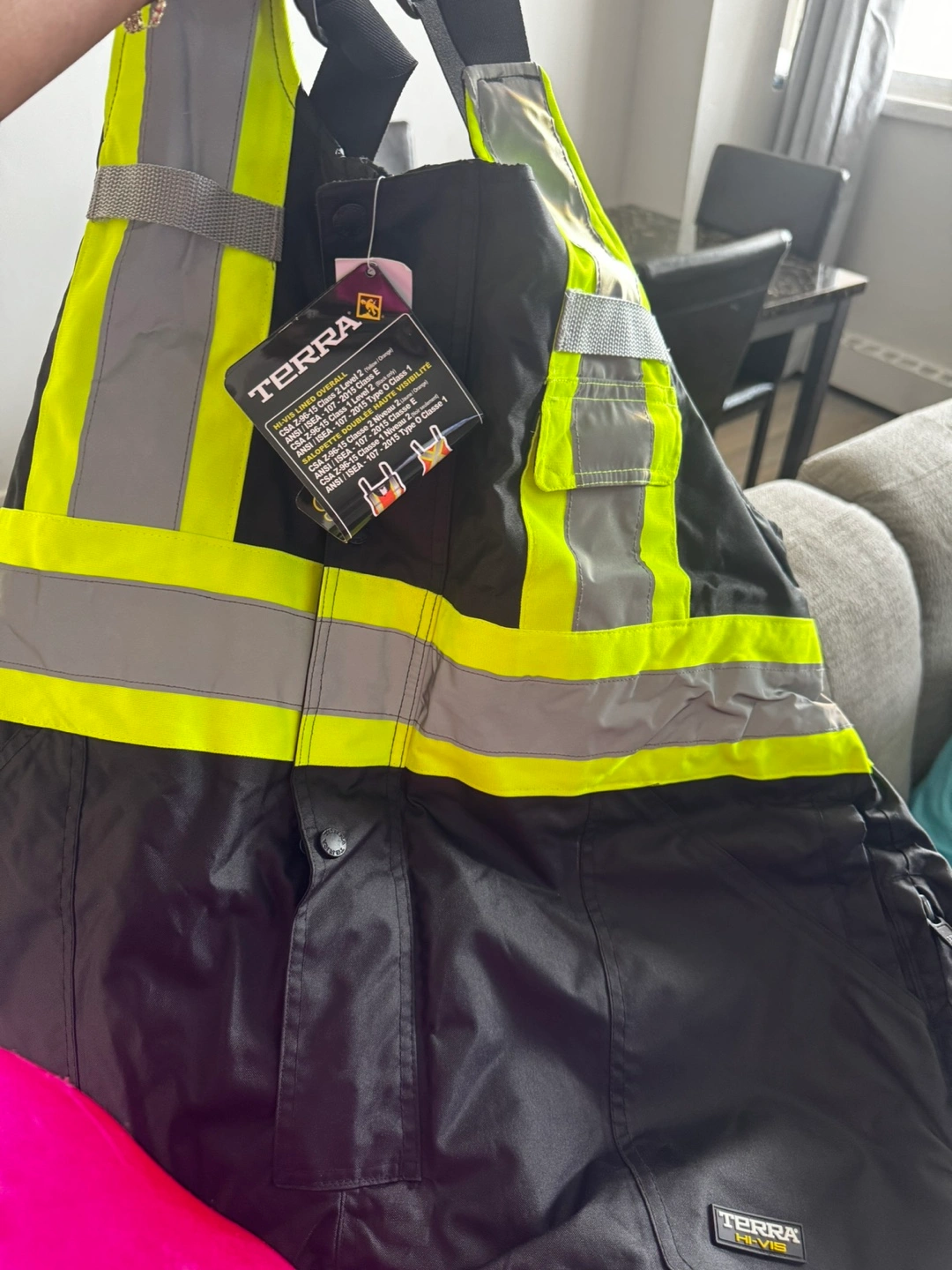 Black insulated bib overalls. High visibility lime and silver reflective tape. Multiple pockets. Brand new with tags.