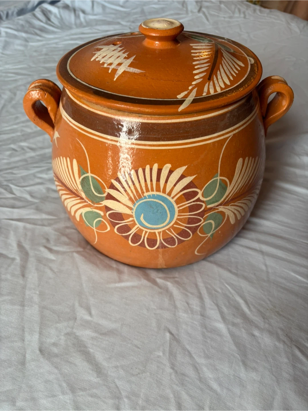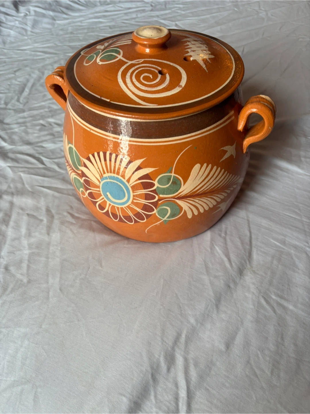 Selling a unique, handmade terracotta cooking pot! It features a beautiful orange colour with hand-painted floral designs. The pot comes with a matching lid and has two sturdy handles for easy carrying. Perfect for adding a touch of rustic charm to your kitchen!