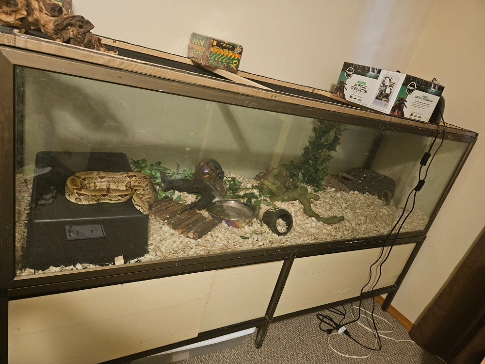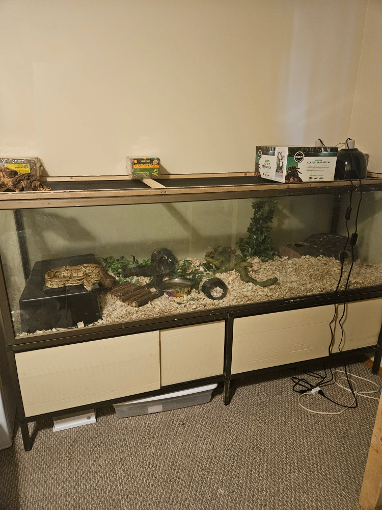 Selling a large aquarium tank, perfect for reptiles or fish! Snake and decorations not included but it does come with the screen top. It is VERY heavy and requires at least 2 strong individuals. Must pick up, delivery not available. 78Lx22Wx24H, stand is 22"H.