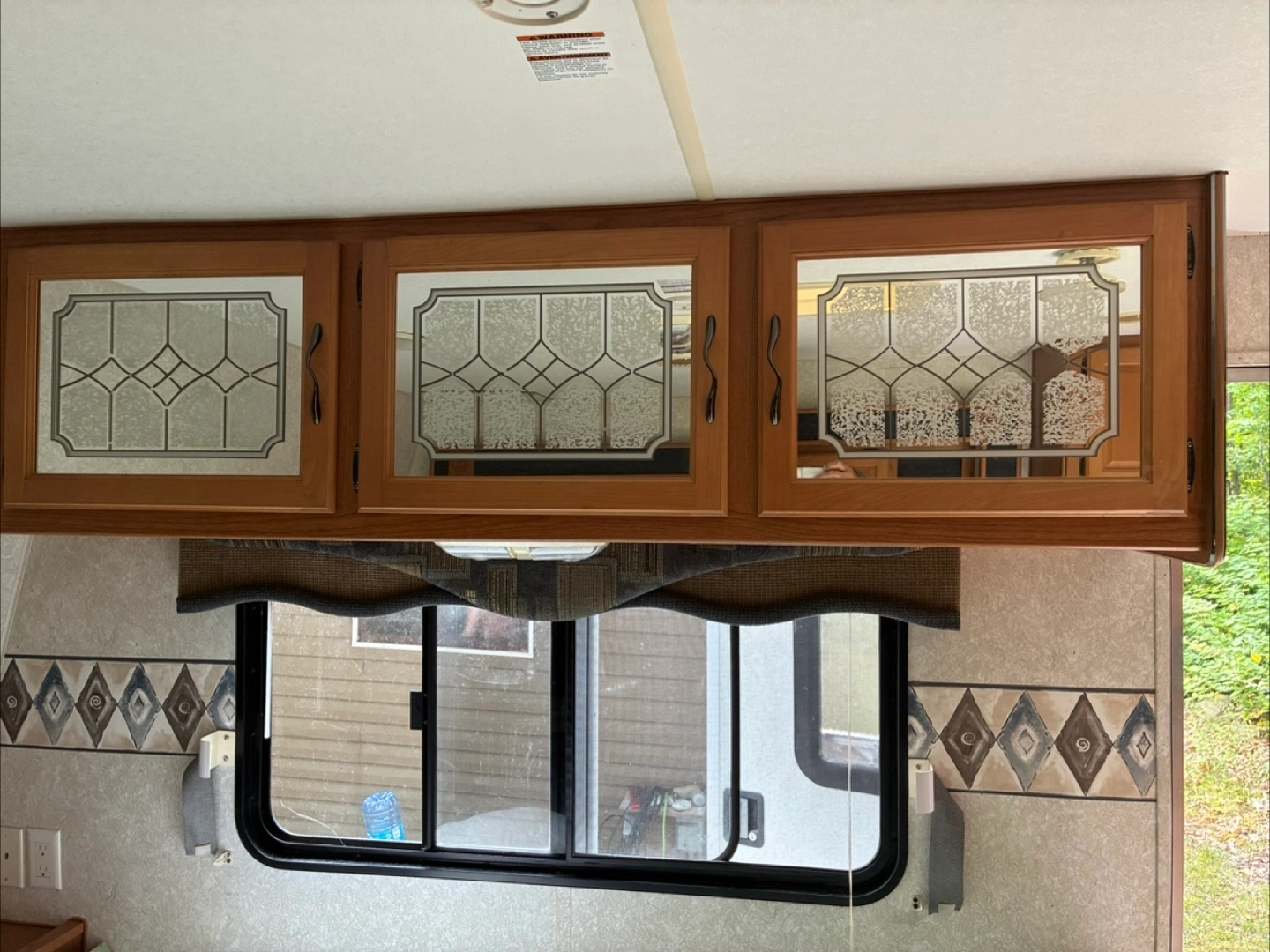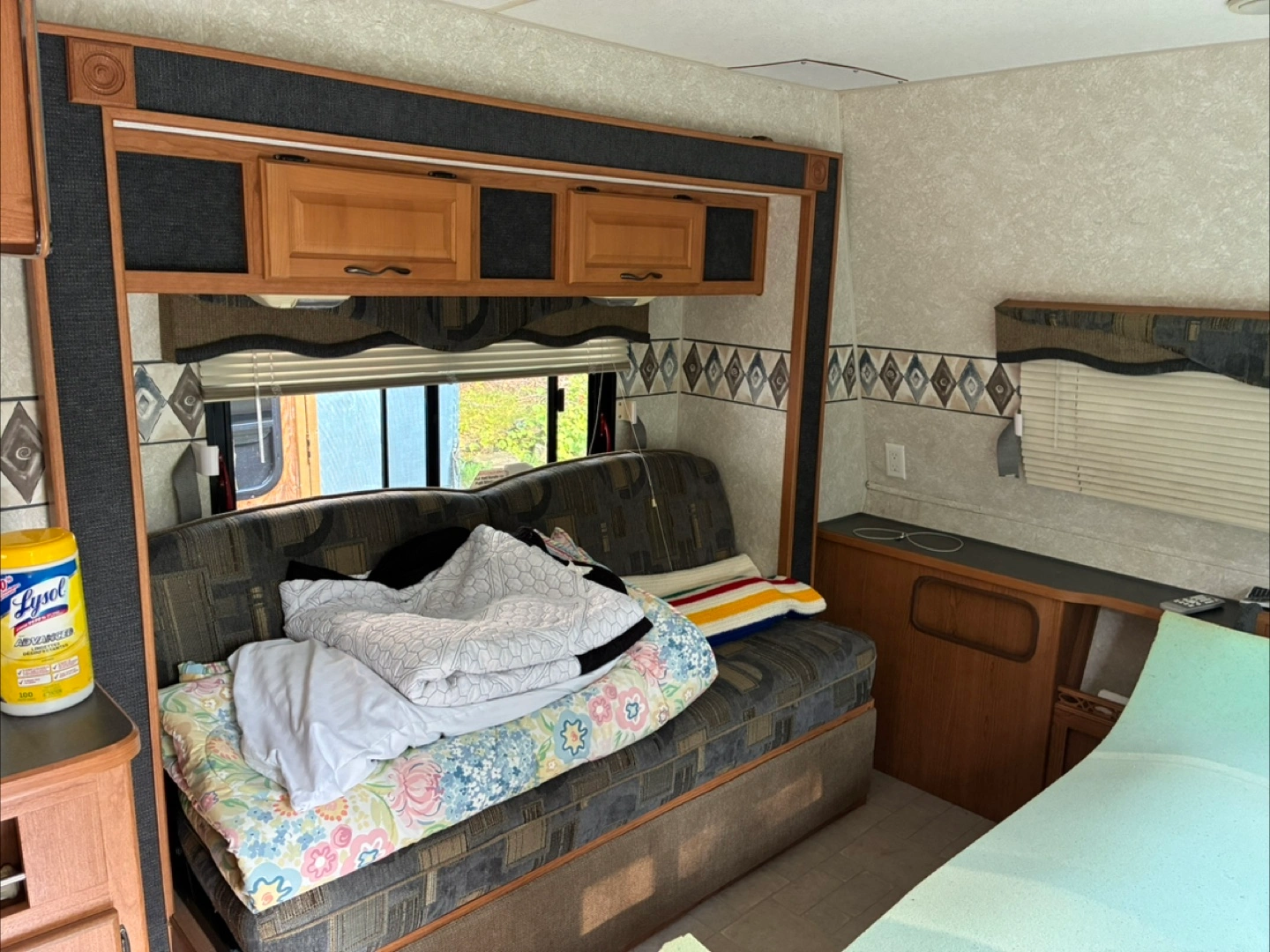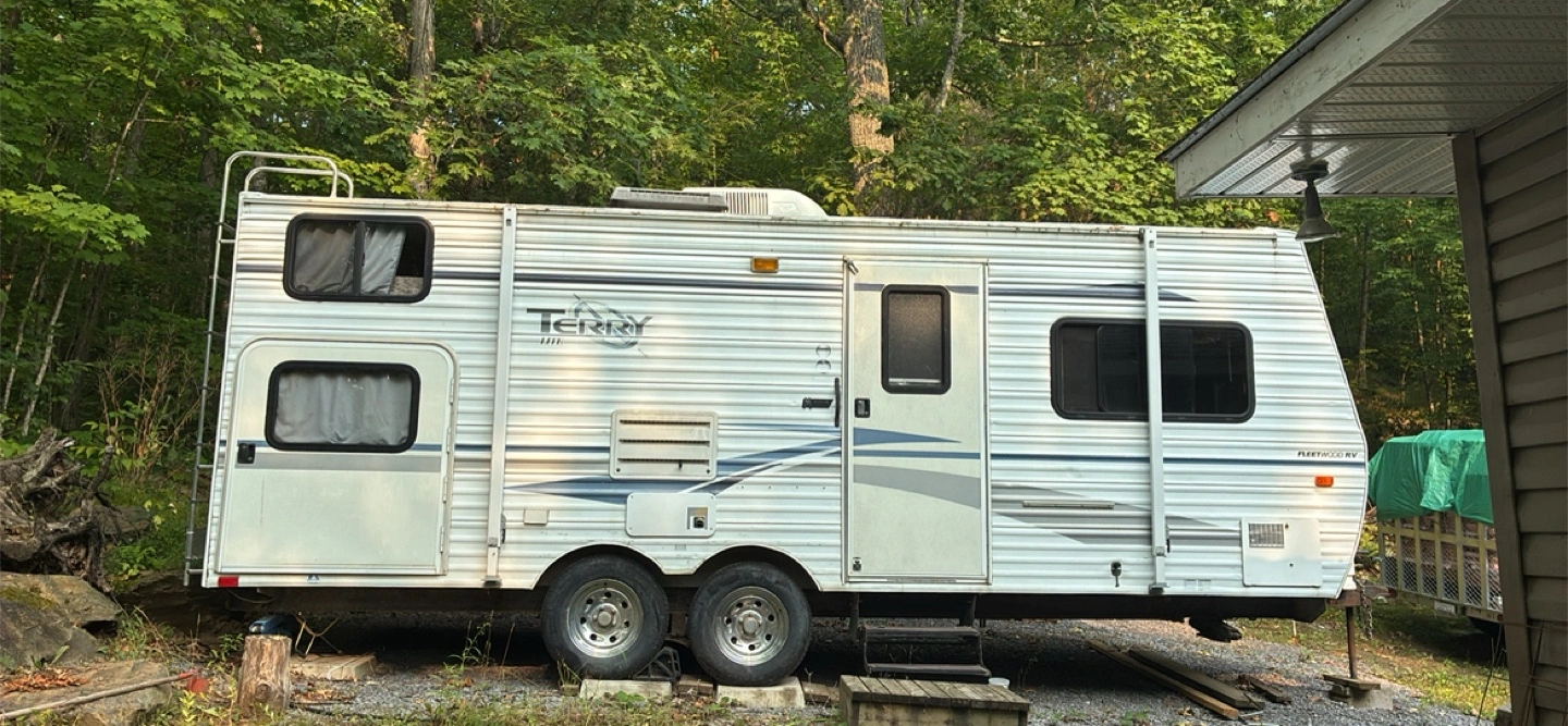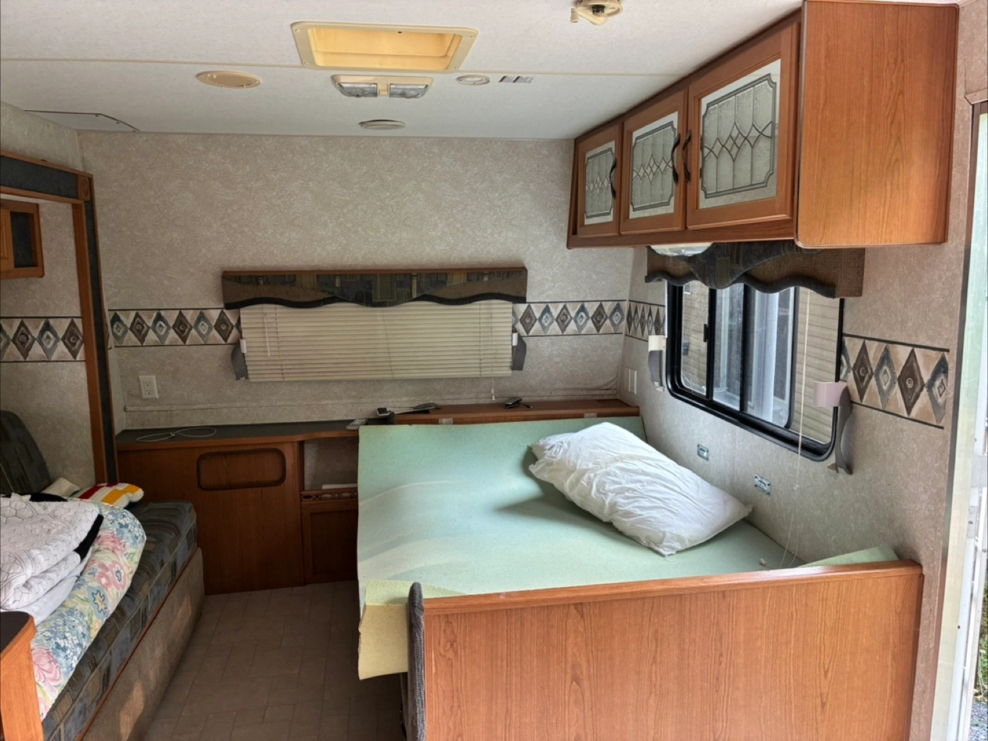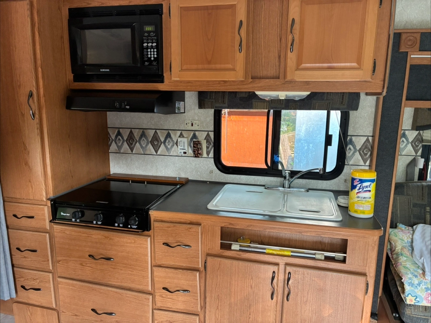 Selling a Terry Fleetwood RV trailer. It has a kitchen with a Samsung microwave and a Suburban stovetop. The interior includes beds, cabinets, and seating areas. Great for camping or a bunkie. Smoke free