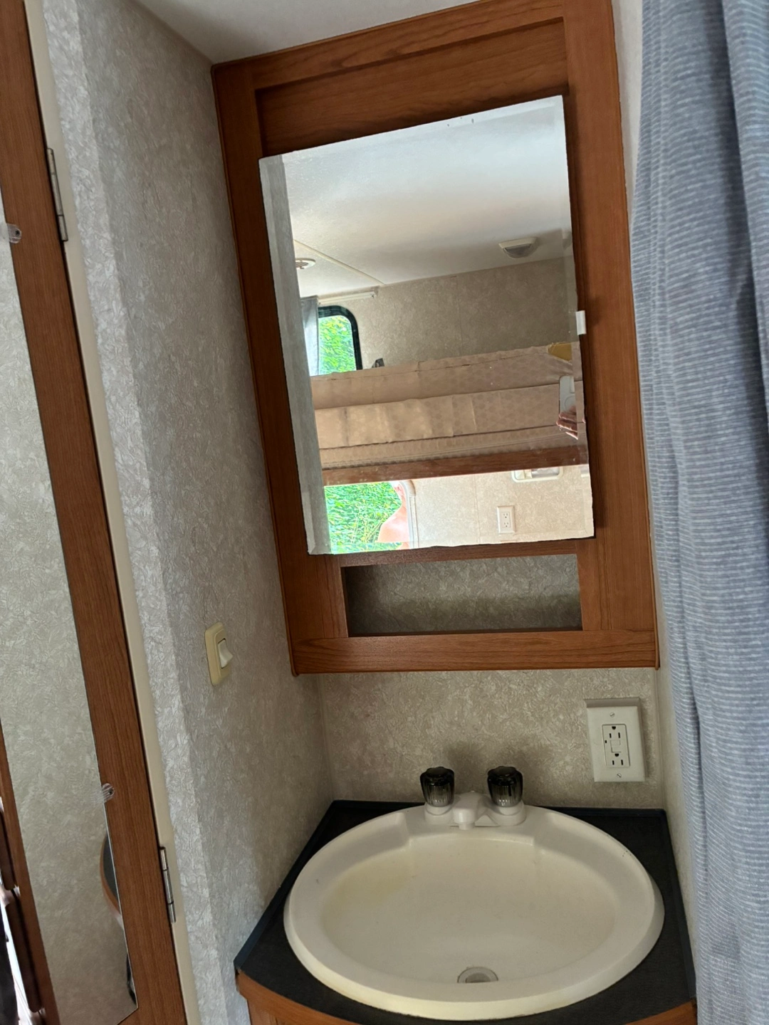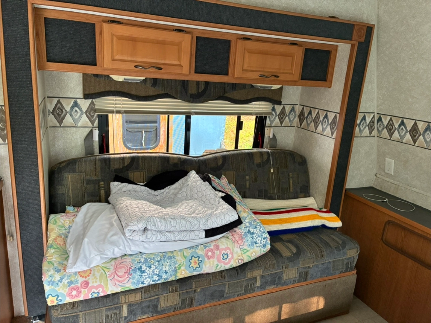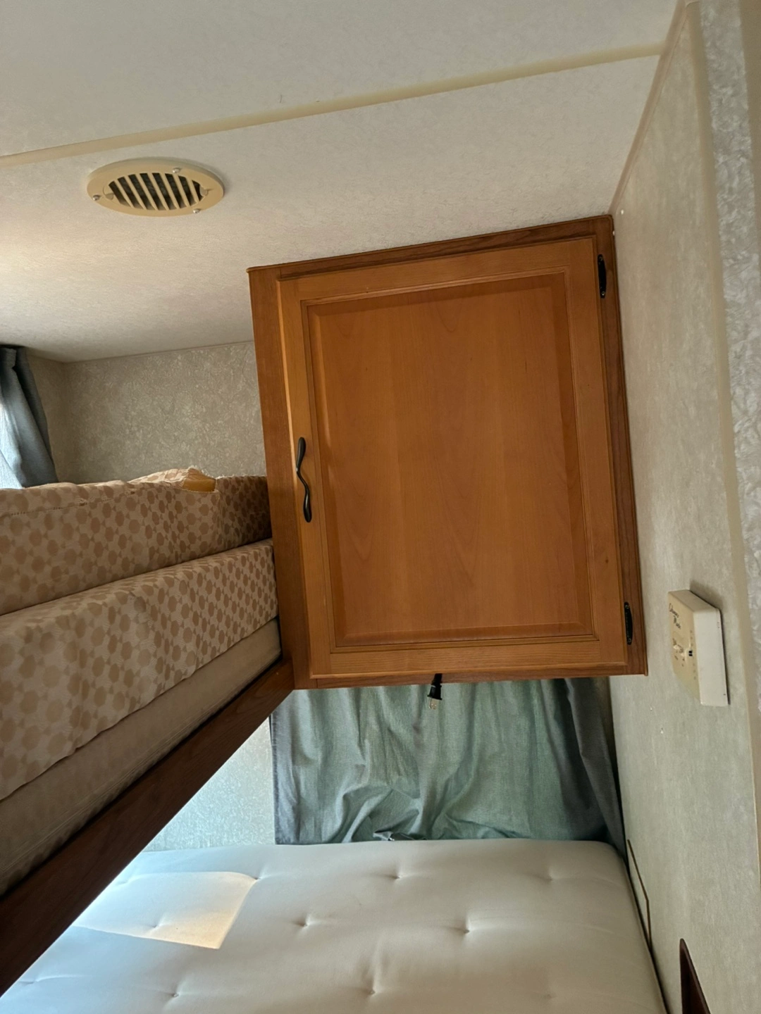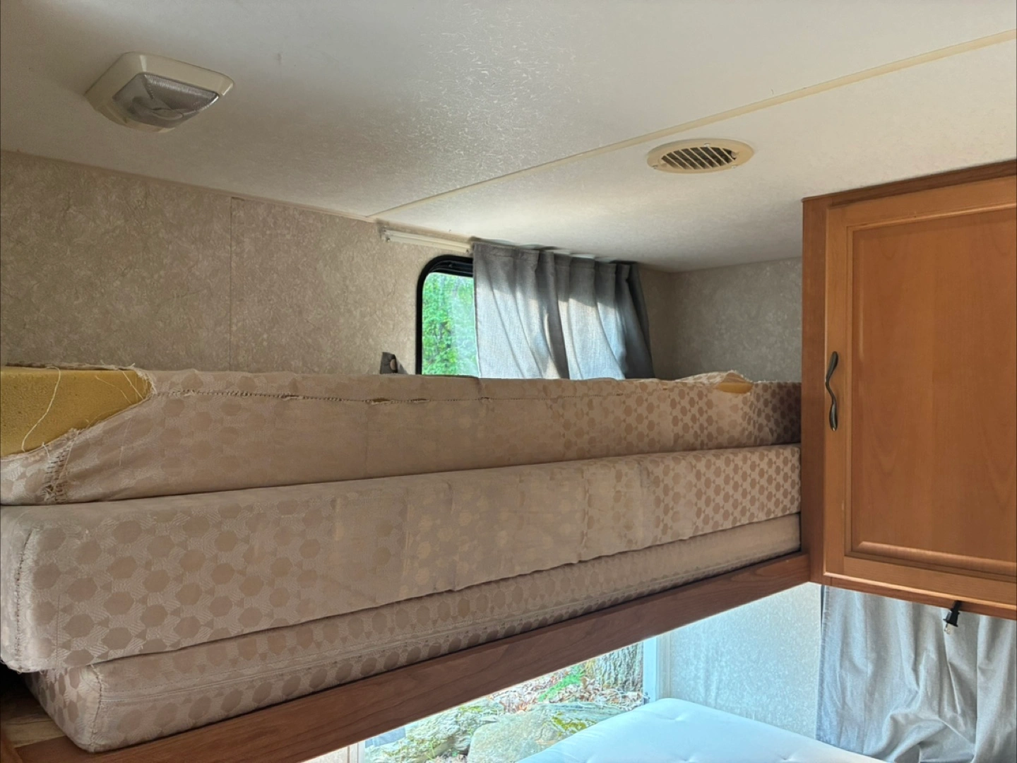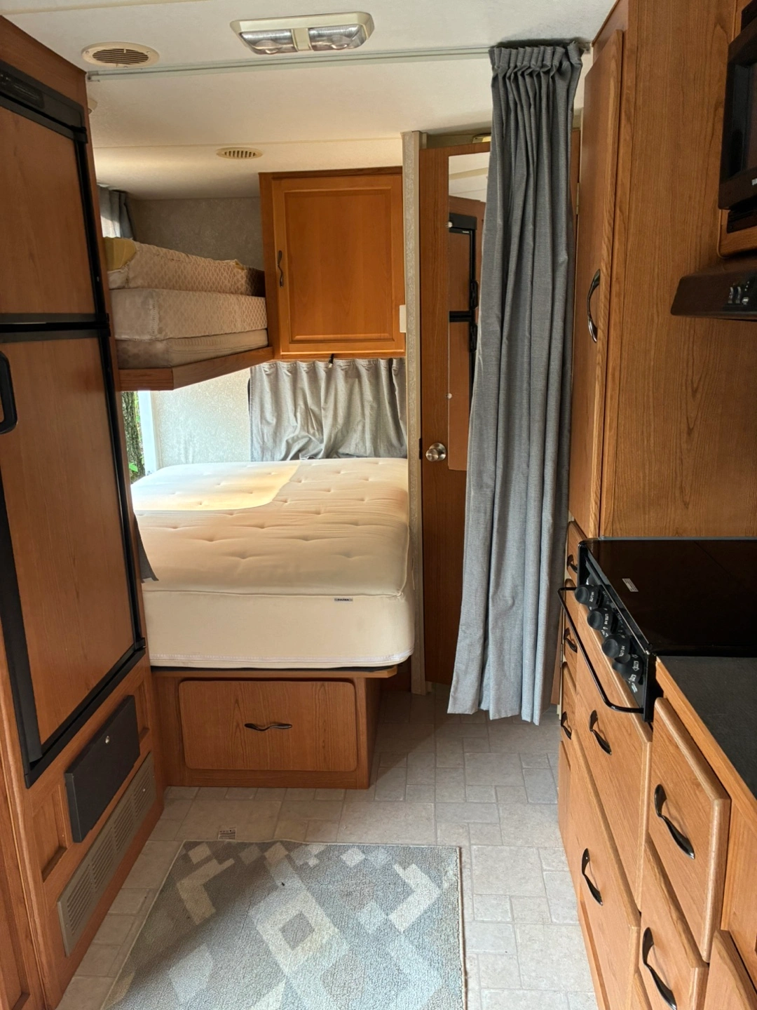 Selling a Terry Fleetwood RV trailer. It has a kitchen with a Samsung microwave and a Suburban stovetop. The interior includes beds, cabinets, and seating areas. Great for camping or a bunkie. Smoke free