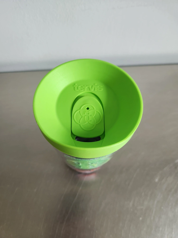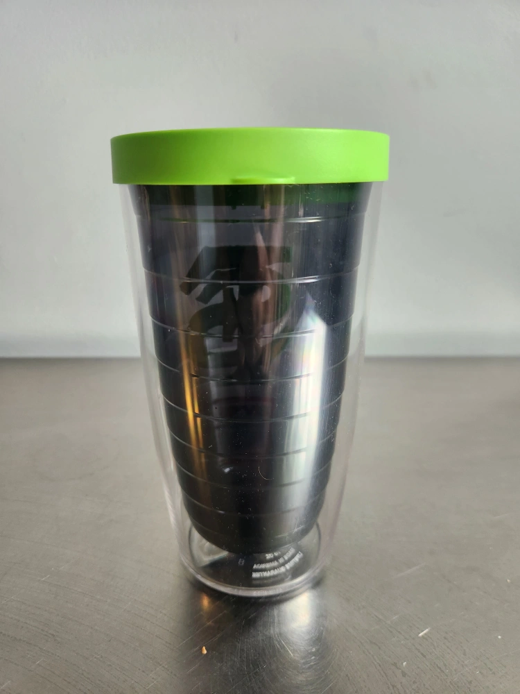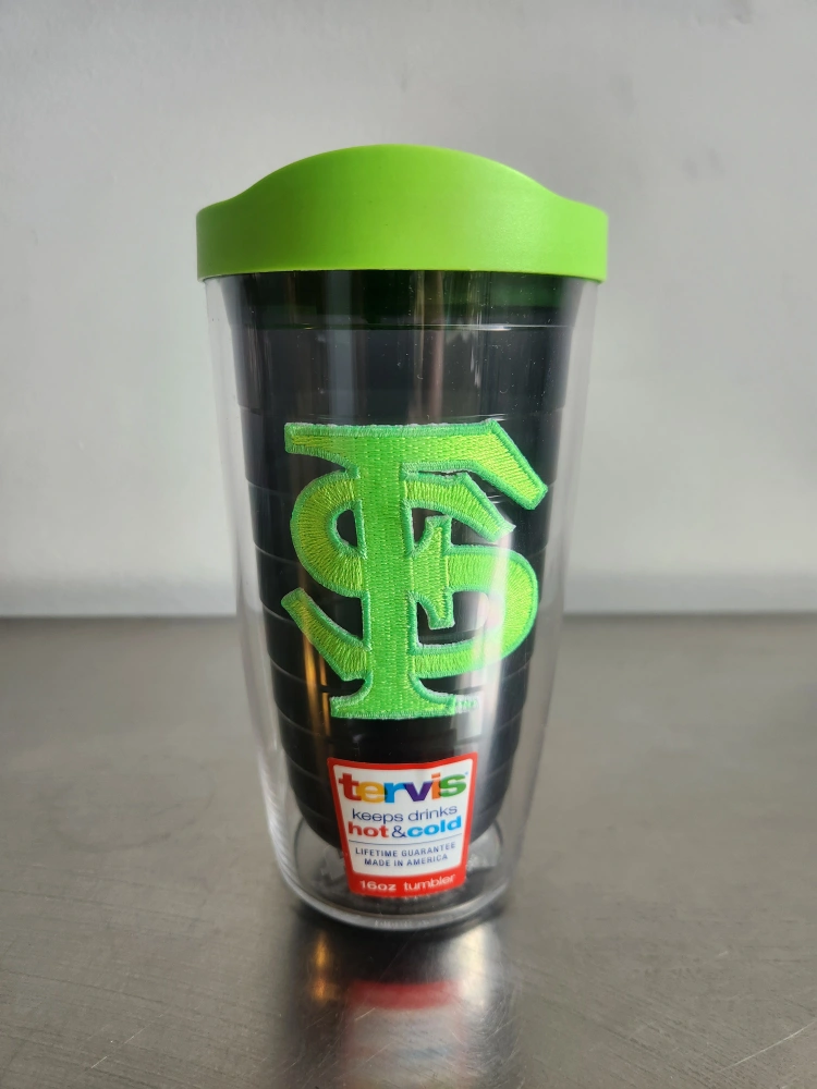 I'm selling a Tervis 16oz tumbler. It keeps drinks hot and cold. It has a green lid and is dishwasher safe.