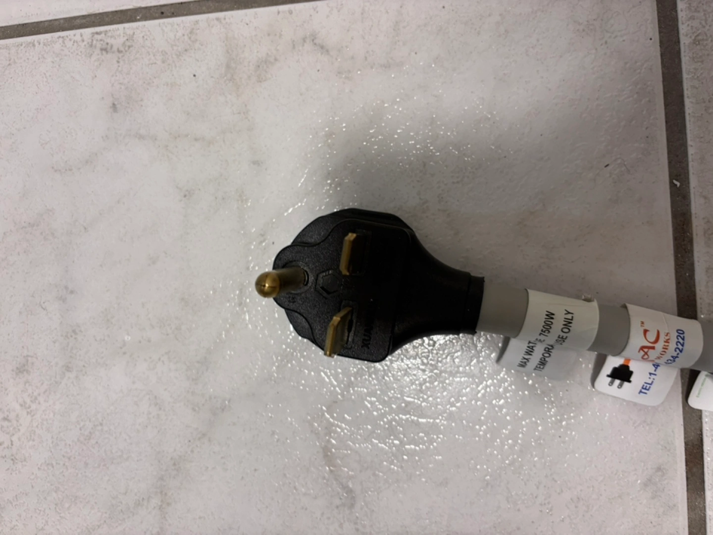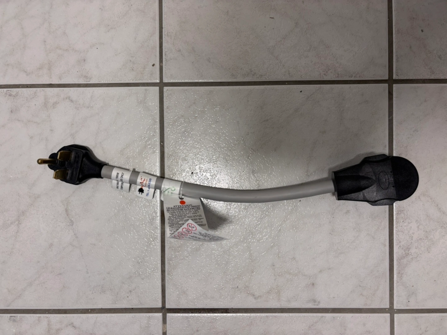 RV adapter, converts 30-amp RV plug to standard household outlet. Grey cord. Good condition.