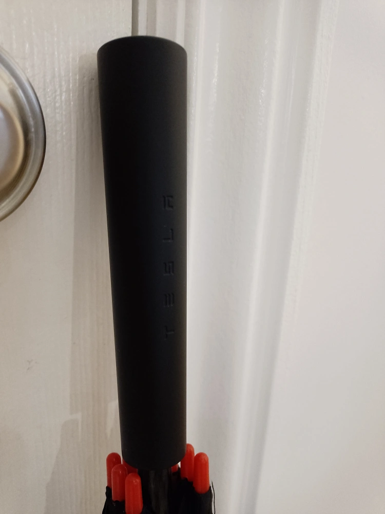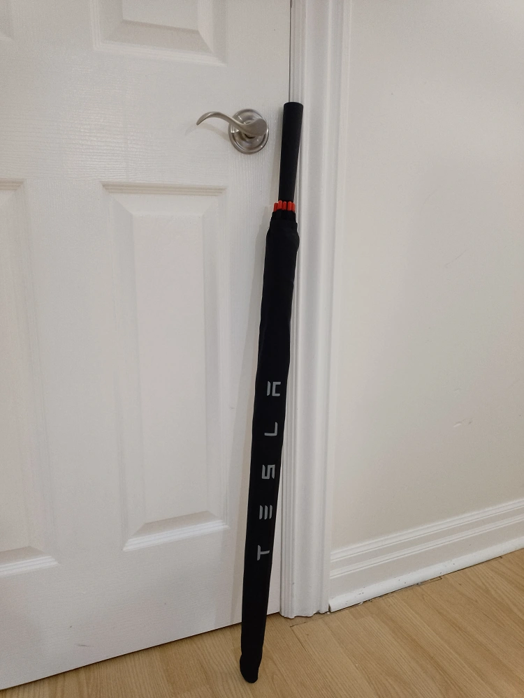 Hi, this is a brand new, never used Tesla umbrella. I took out the wrapping just to take some pictures. Tesla is engraved in the ergonomic handle. Large size, can fit 2 people. Comes from a pet free and smoke free home.