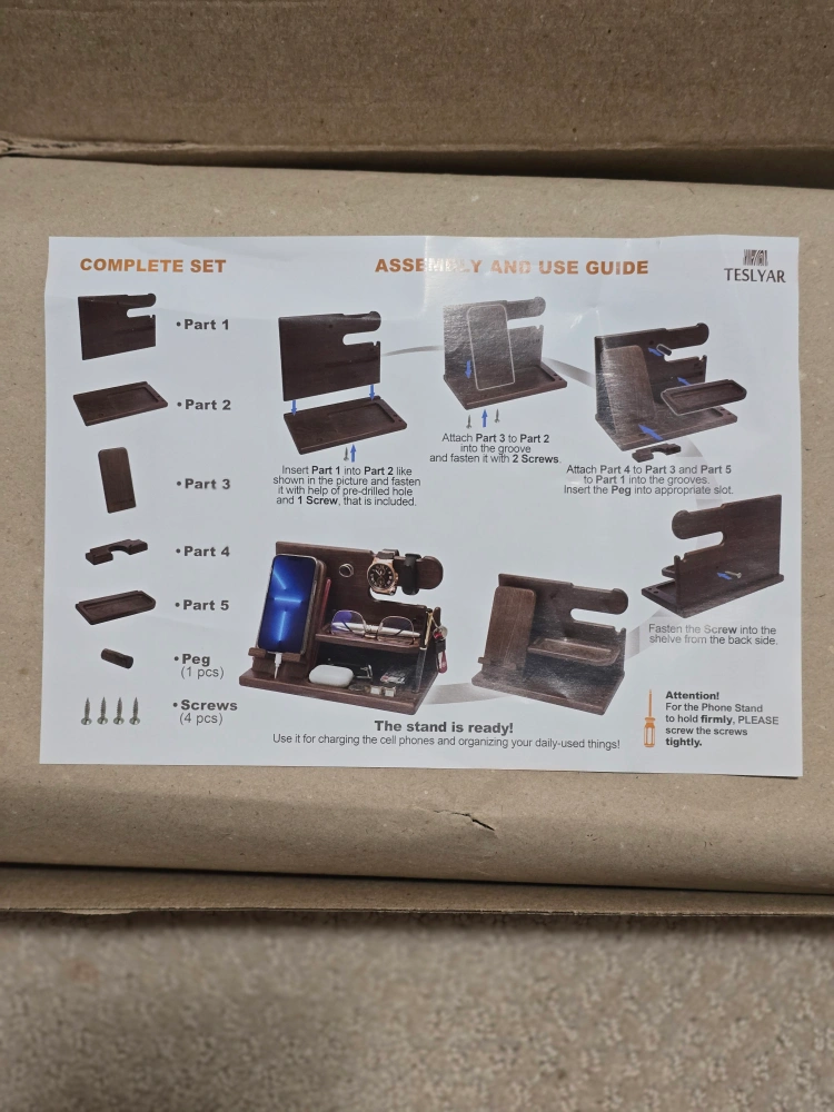 Brand new, unassembled wooden phone stand. Includes all parts and instructions. Organizes your daily essentials. Sleek and modern design.