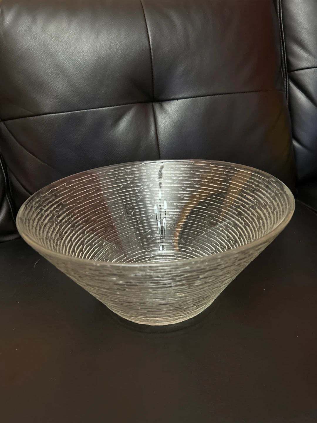 Selling a clear glass bowl with a textured design. It's in great condition and would be perfect for serving or as a decorative piece in your home