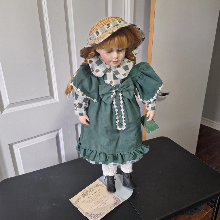 This is a beautiful porcelain doll from The Anne of Green Gables Collection. It comes with a certificate of authenticity and is numbered 2500. The doll is wearing a green dress and hat.