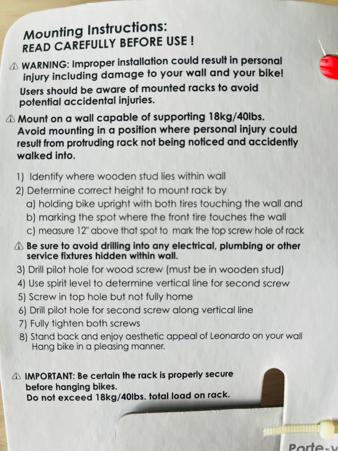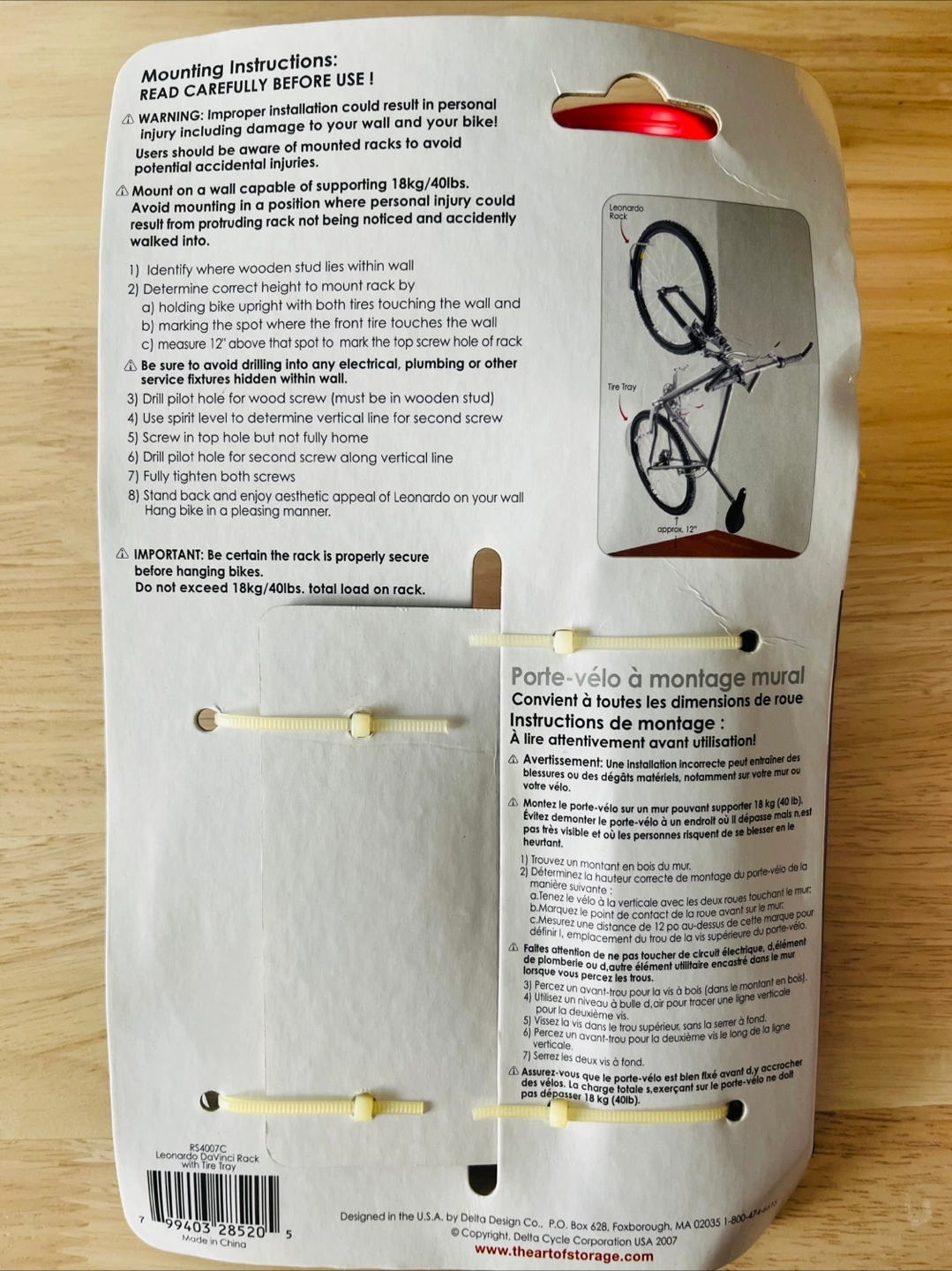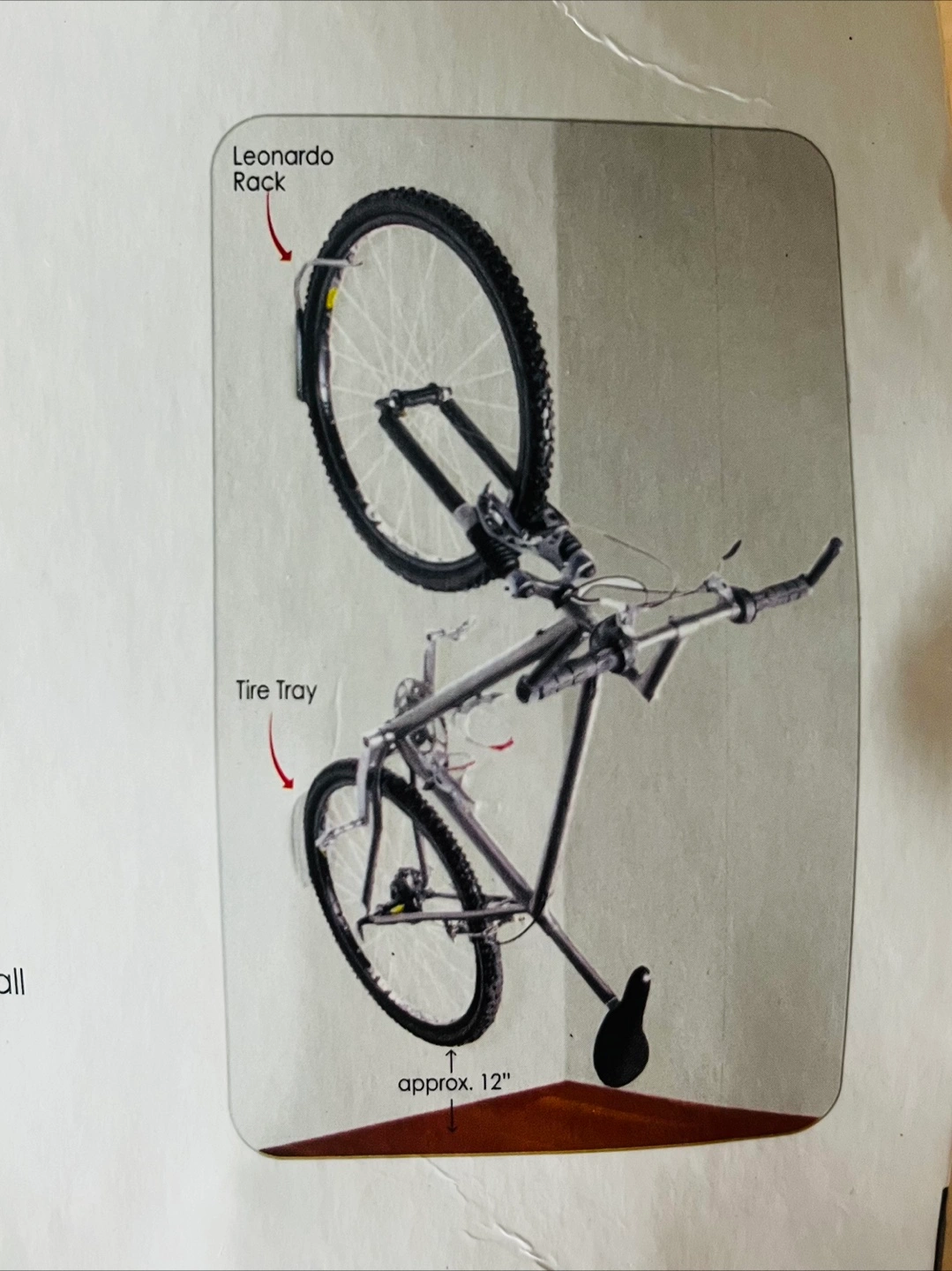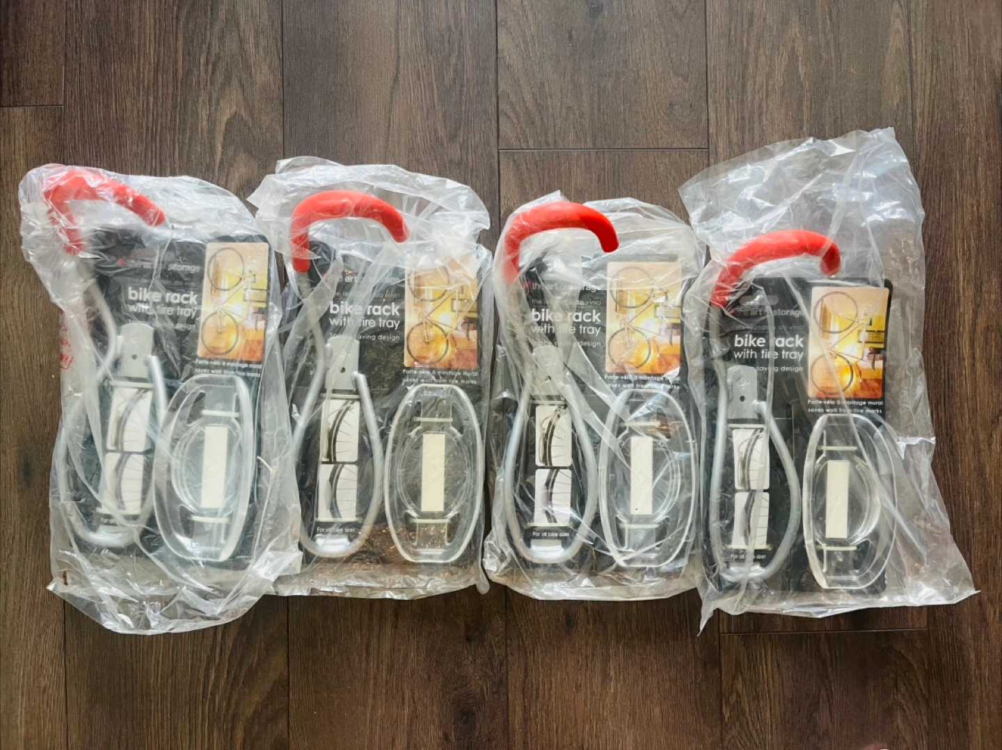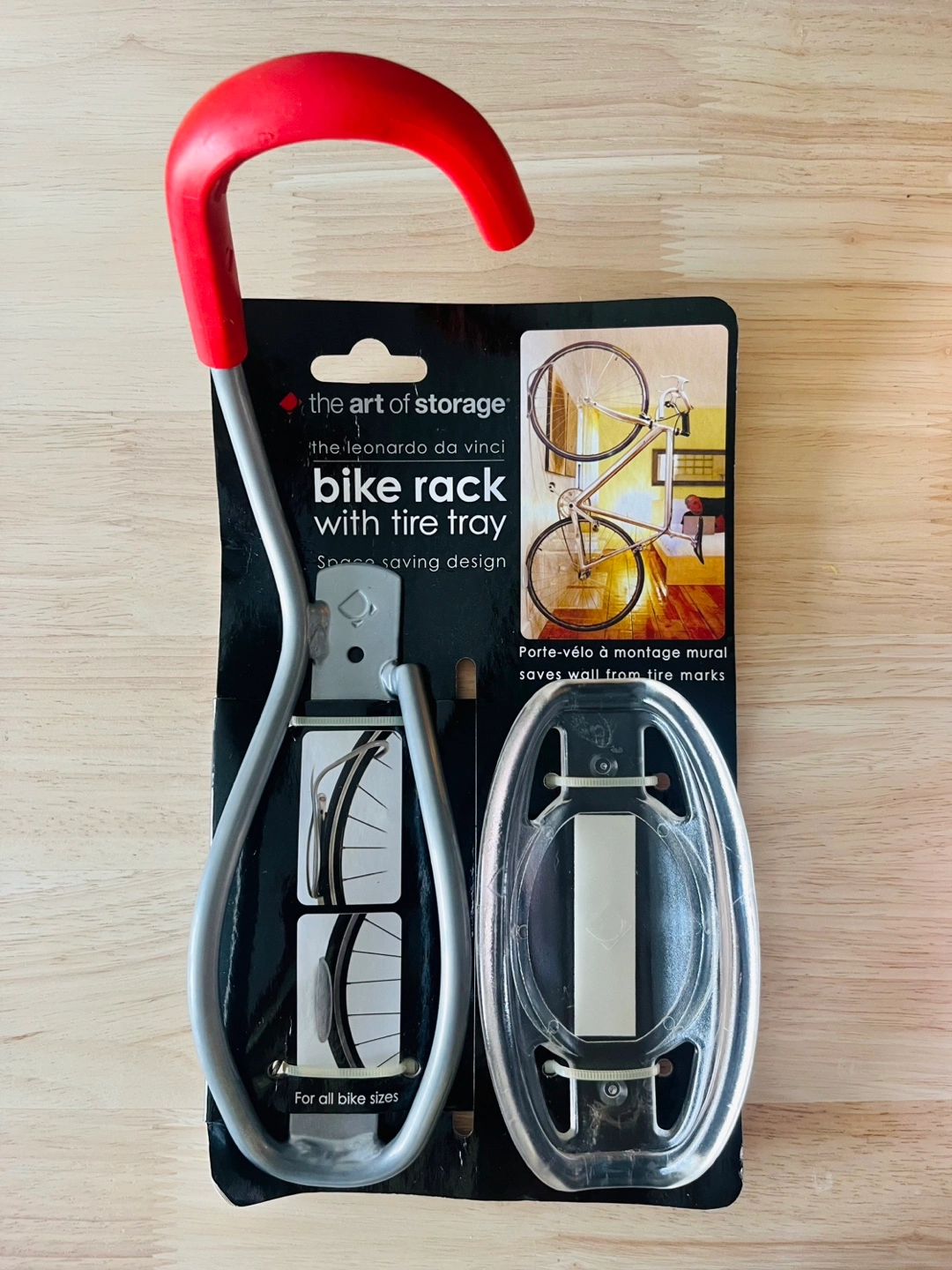 Get your bike up off the floor with this Leonardo Da Vinci bike rack and tire tray! It's a space-saving design that mounts on the wall, saving your walls from tire marks. It's designed for all bike sizes and can support up to 18kg/40lbs $20 each or $75 for 4