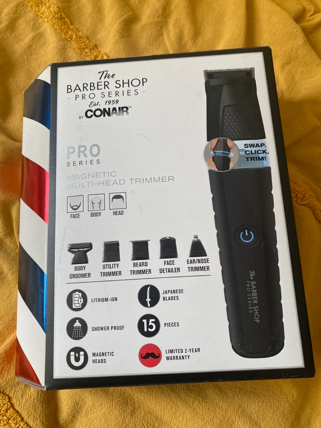 Selling The Barber Shop Pro Series Magnetic Multi-Head Trimmer by Conair. It includes 15 pieces with Japanese blades. It features magnetic heads and a limited 2-year warranty. It has multiple attachments to trim face, body, and head. It is also shower proof