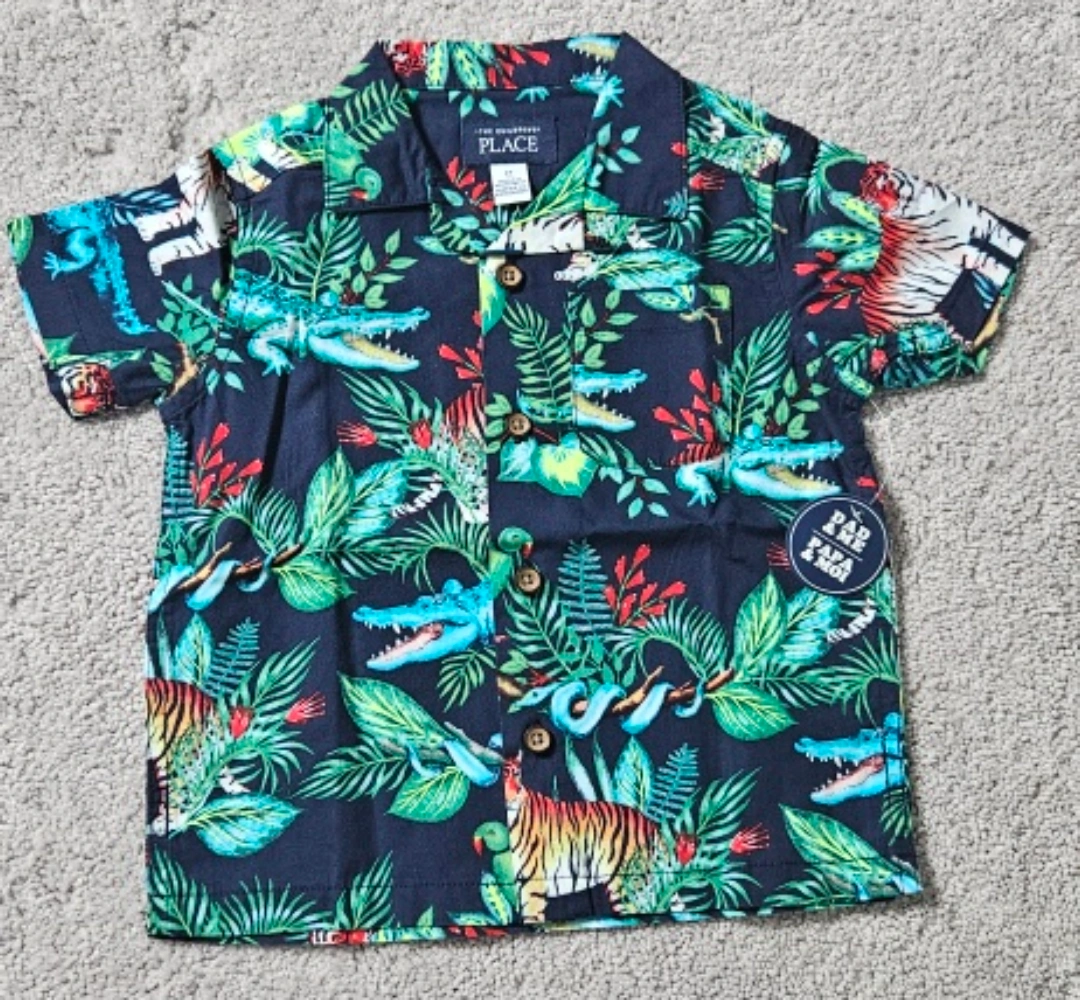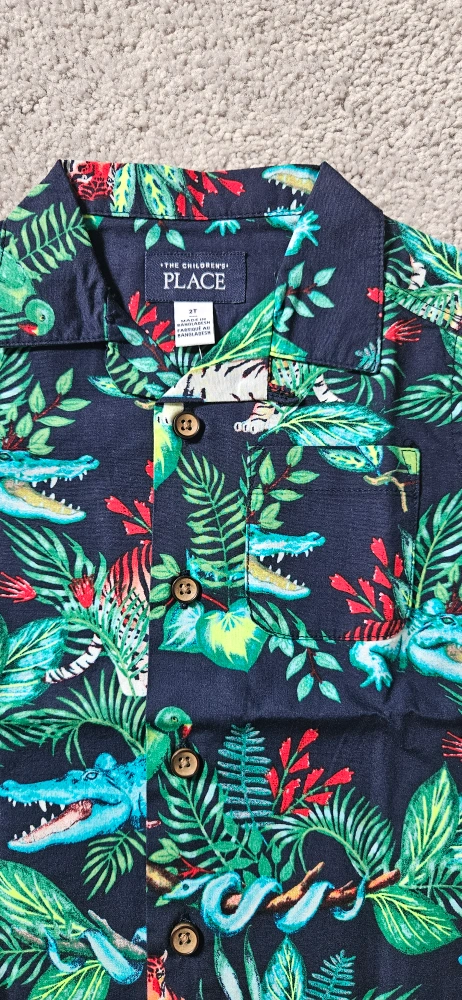 This adorable shirt from The Children's Place is perfect for your little one! It features a fun tropical print with alligators, tigers, and foliage. The size is 2T, and it's in great condition. Perfect for summer!