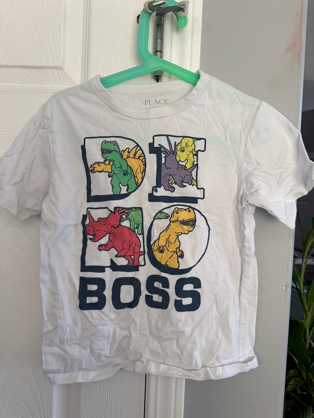 A cute dinosaur graphic tee from The Children's Place! It's a size S/P 5/6 and in great condition. The design features colourful dinosaurs and the words 'Dino Boss'. Perfect for your little one!
