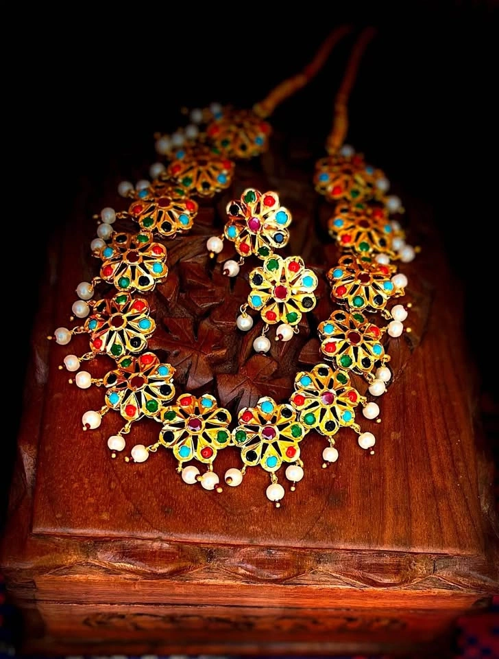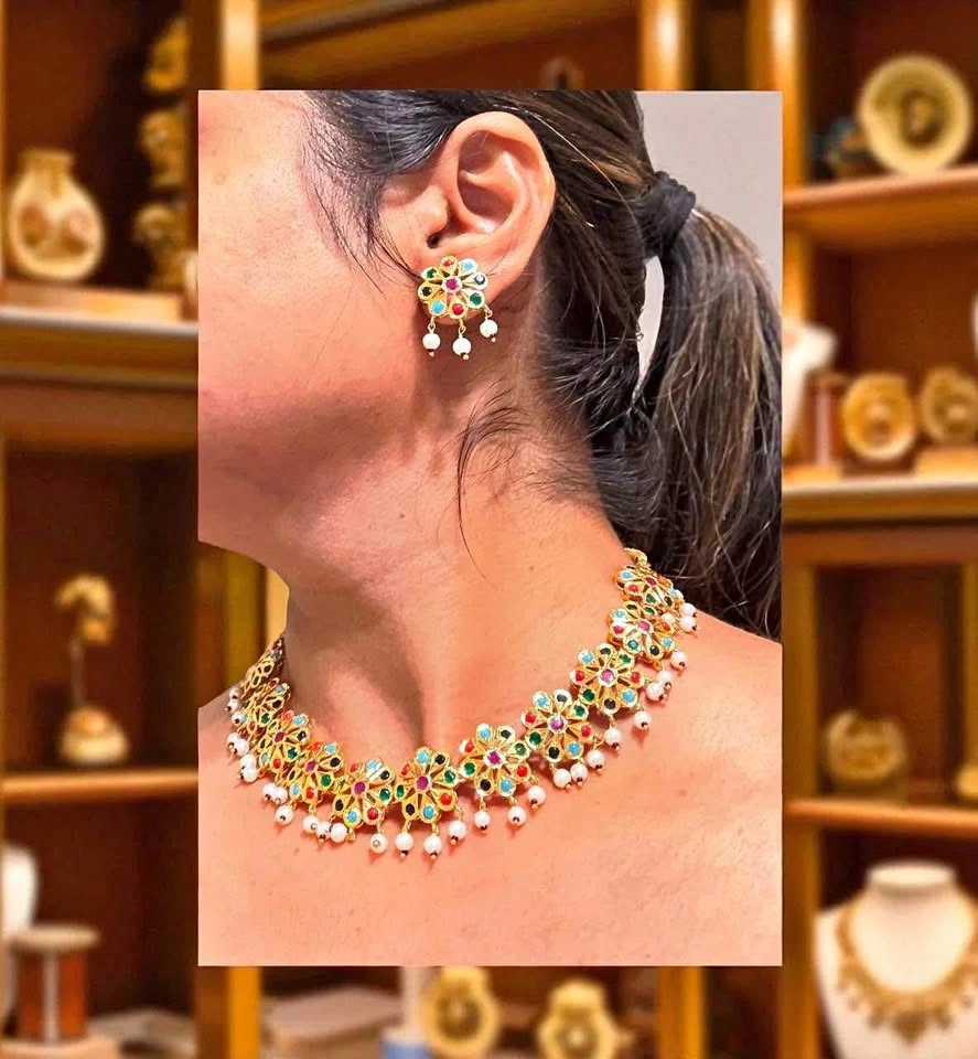 A delicate, perfectly crafted flowers strung together to form a flawless choker necklace with matching floral jadau ear studs. Ear Studs : L x W = 1.5 cm x 1.5 cm Jewelry Care : Avoid direct contact with water or chemicals like perfume, sanitizers etc. Store your jewelry in a clean, dry and air tight packaging after use.