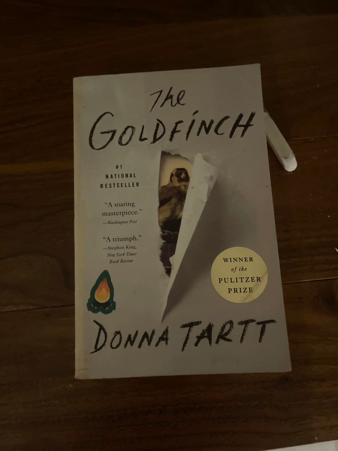Selling a copy of "The Goldfinch" by Donna Tartt. It's a #1 National Bestseller and a winner of the Pulitzer Prize! A great read for anyone who enjoys a soaring masterpiece. Visable damages to book—discounted!