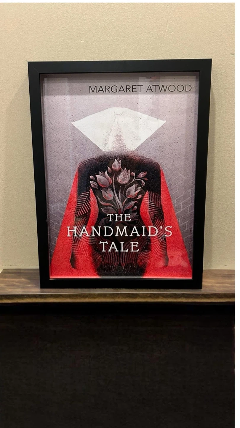 Framed wall art featuring the cover of Margaret Atwood's "The Handmaid's Tale" novel! This piece is in great condition and ready to add a touch of literary charm to your home. 12 x 16 inches