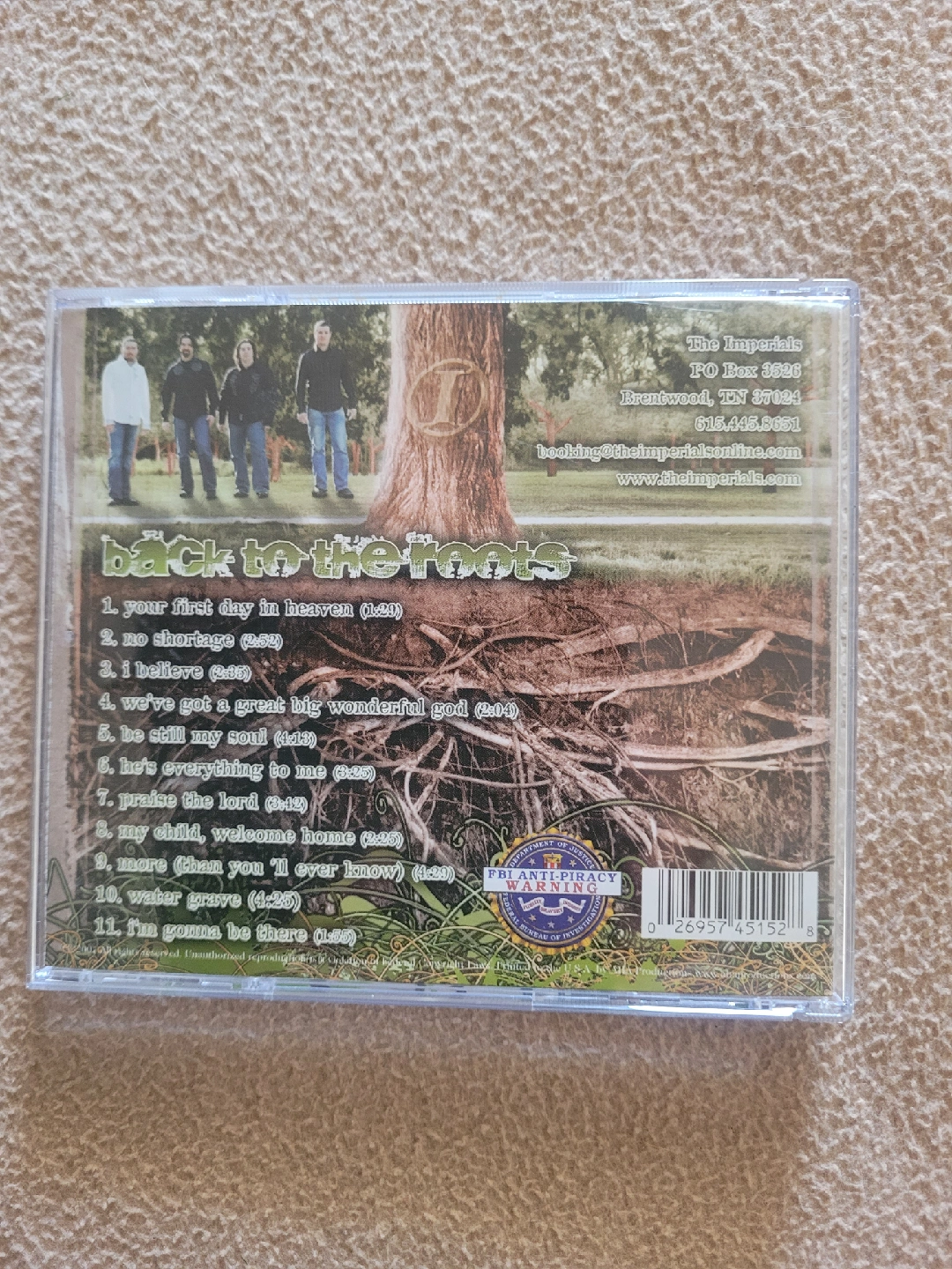 Selling a CD by The Imperials titled 'Back to the Roots' Tracklist: - Your First Day In Heaven - No Shortage - I Believe - We've Got A Great Big Wonderful God - He Still My Soul - He's Everything To Me - Praise The Lord - My Child, Welcome Home - More (Than You'll Ever Know) - Water Grave - I'm Gonna Be There